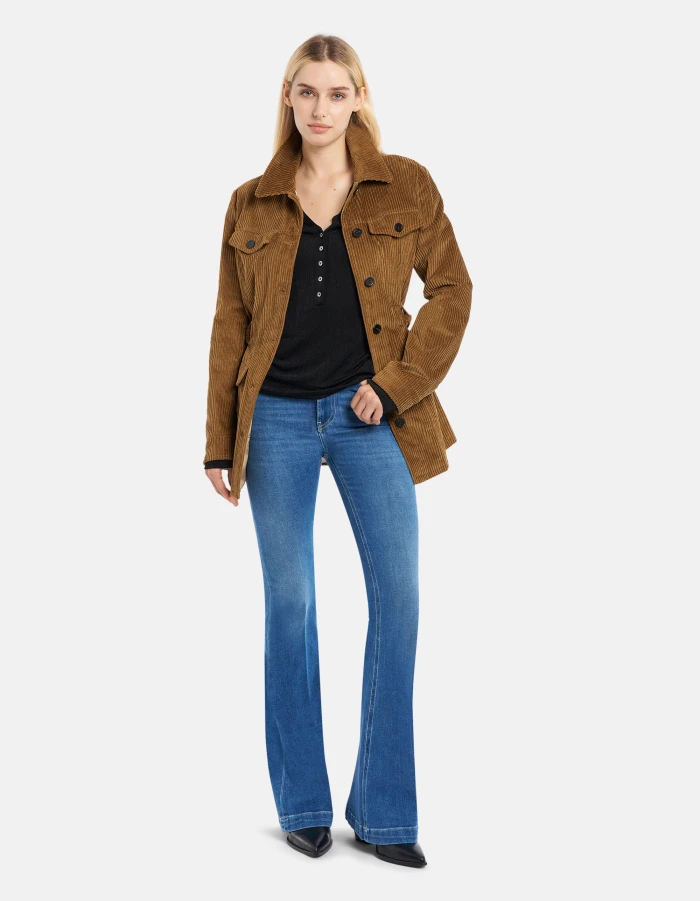 Olivia slim-fit five-pocket bootcut jeans, high waist. Blue 12 1/4 oz comfort stretch denim. Clean medium-light wash. Dondup logo. Made in Italy