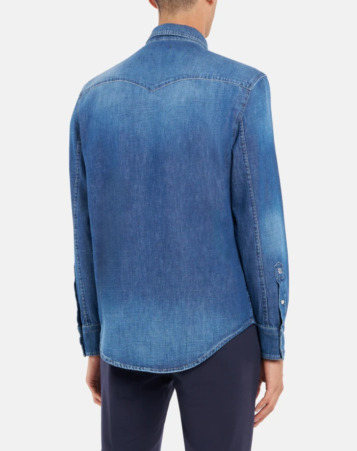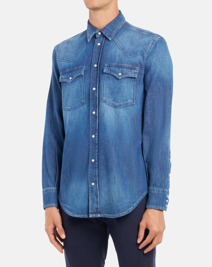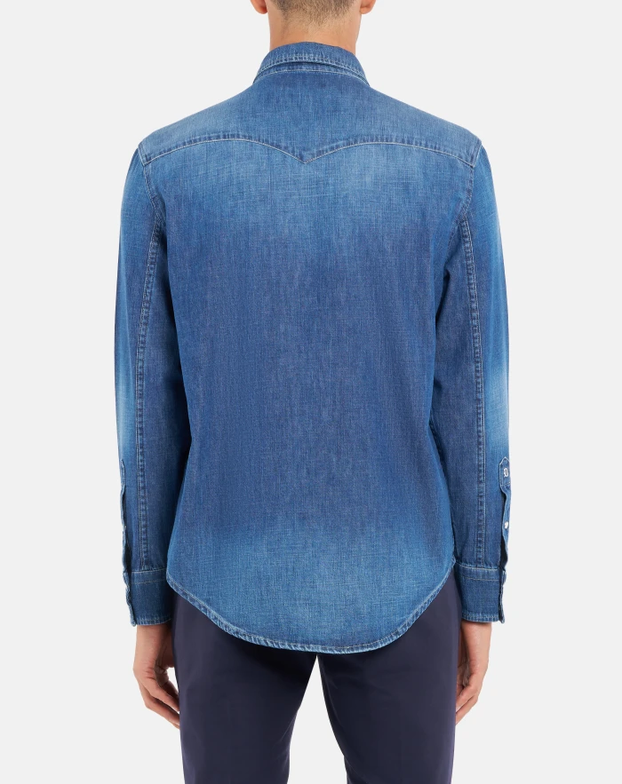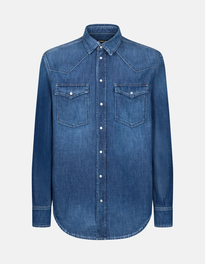 Regular-fit Western-style shirt with pointed yoke at the front, yoke at the back, flap breast pockets and snap-button fastening. Blue 7 oz rigid denim. Clean medium wash. Dondup logo. Made in Italy