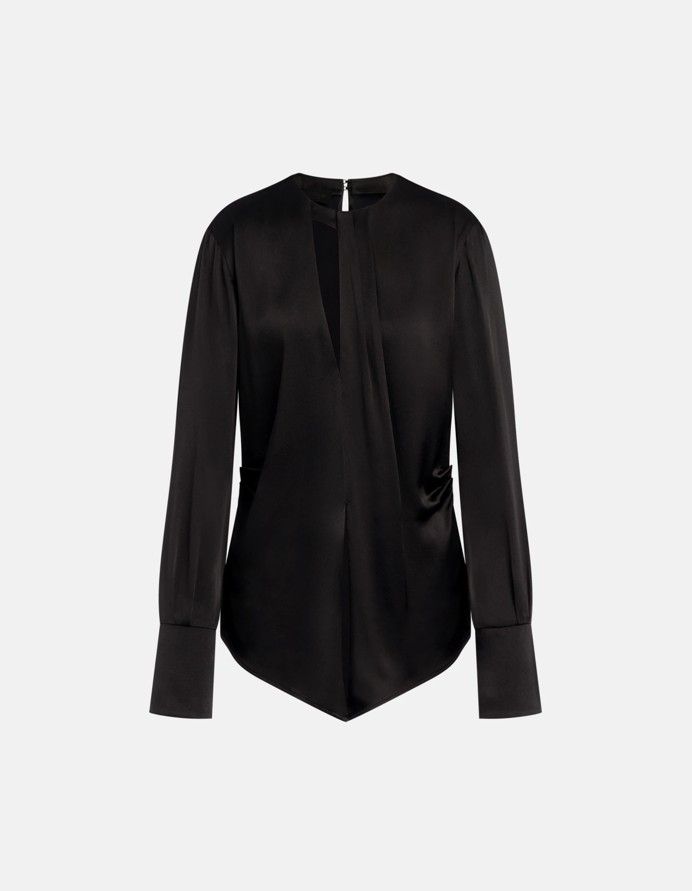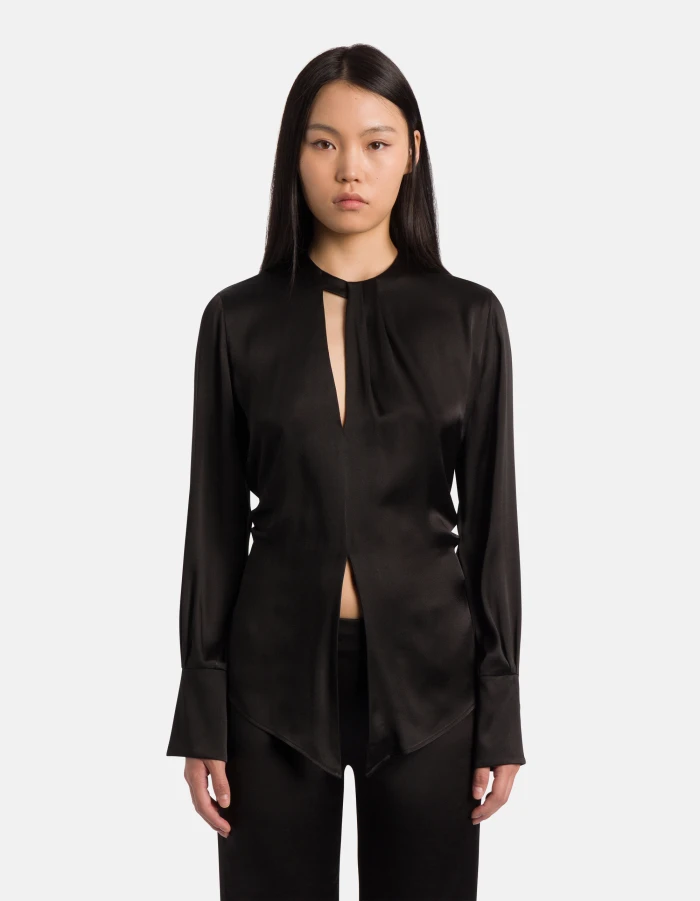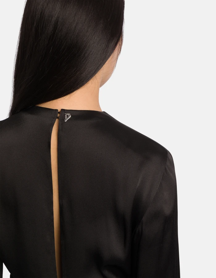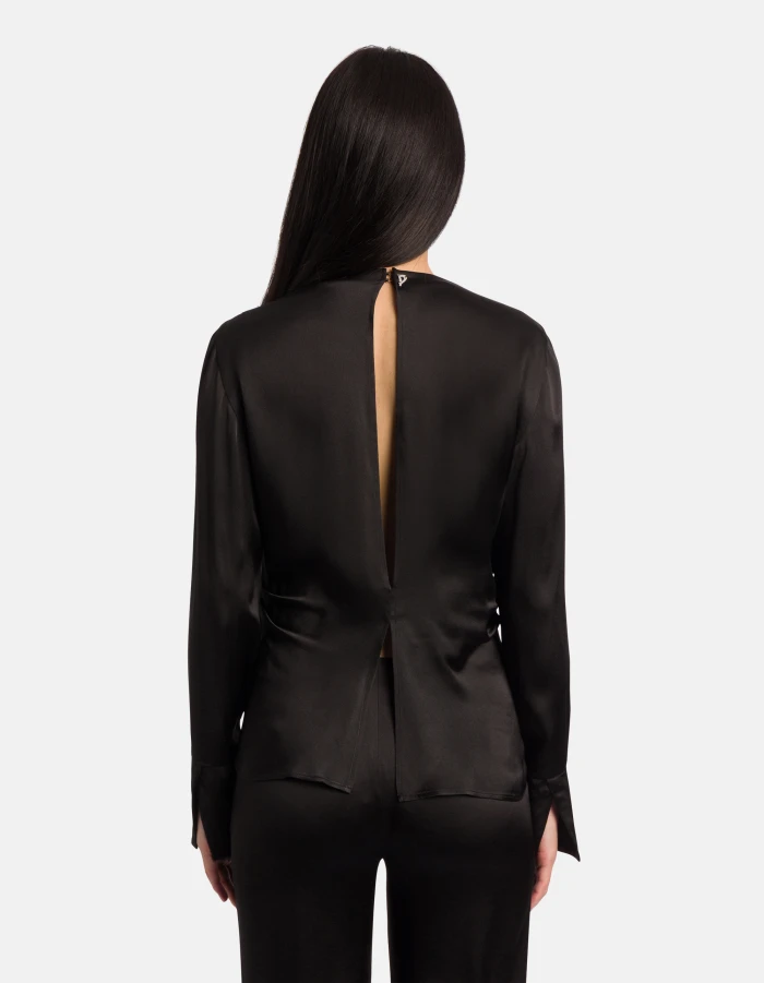 Camicia regular a maniche lunghe con dettaglio su scollo davanti ed apertura sulla schiena fino alla vita. Raso misto seta. Logo Dondup. Made in Italy