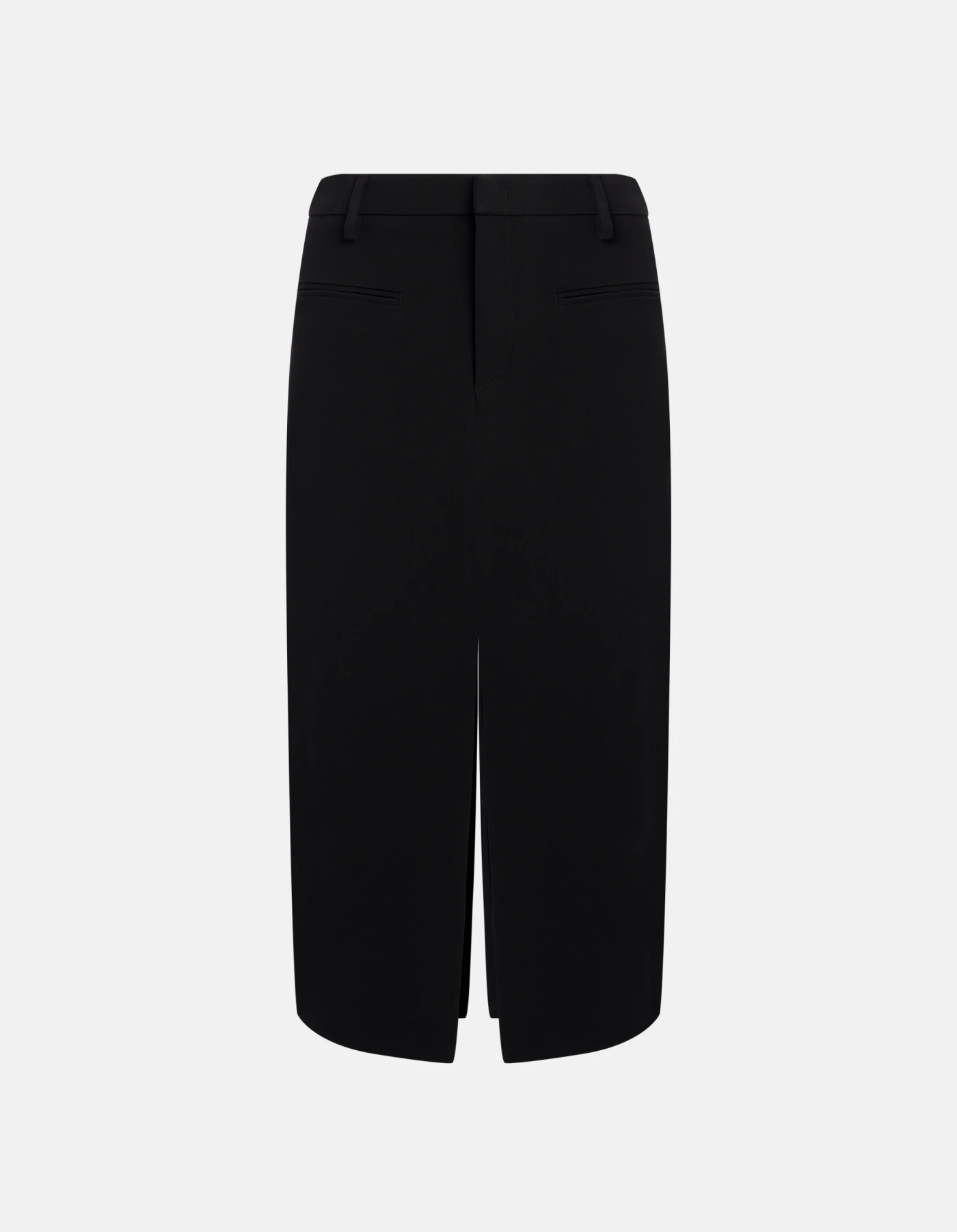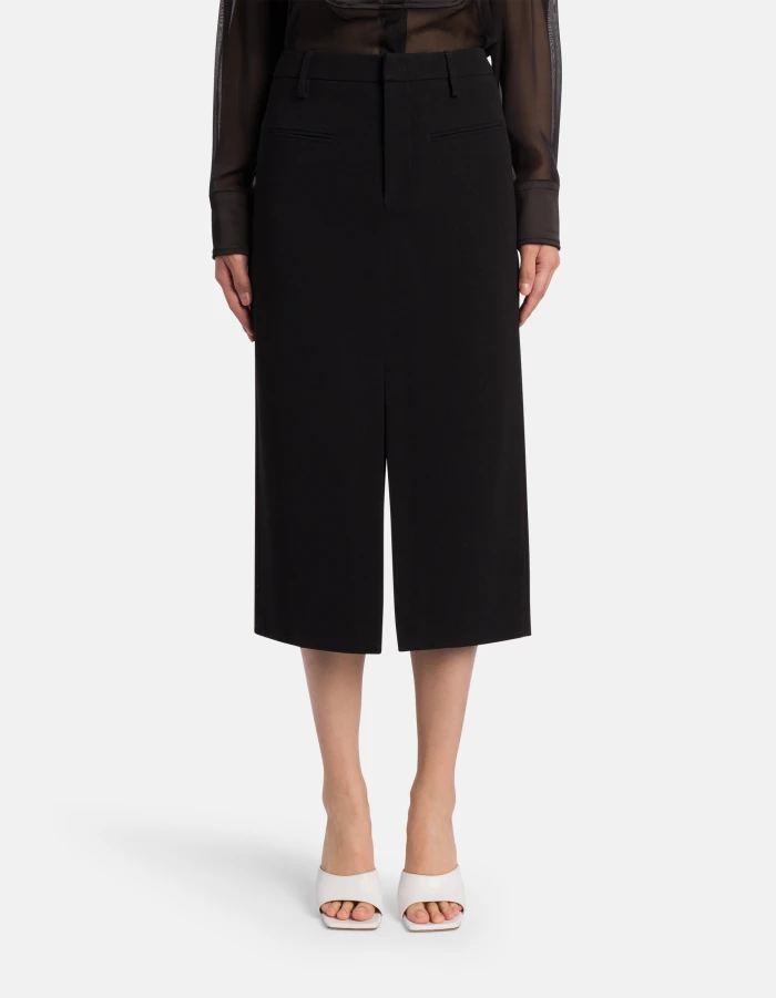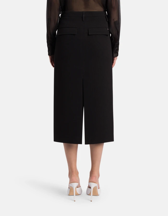 Gonna longuette con spacchi davanti e dietro e tasche posteriori con pattine. Crêpe stretch. Logo Dondup. Made in Italy