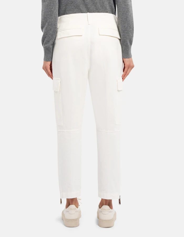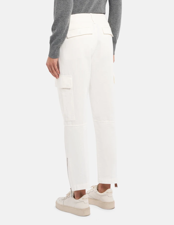 Pantaloni Eve cargo, vita regolare, tasche posteriori con pattine, apertura fondo con zip a vista. Gabardine velour. Logo Dondup. Made in Italy