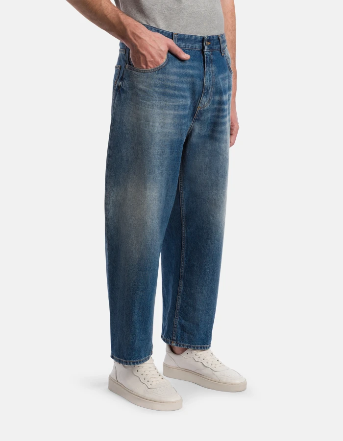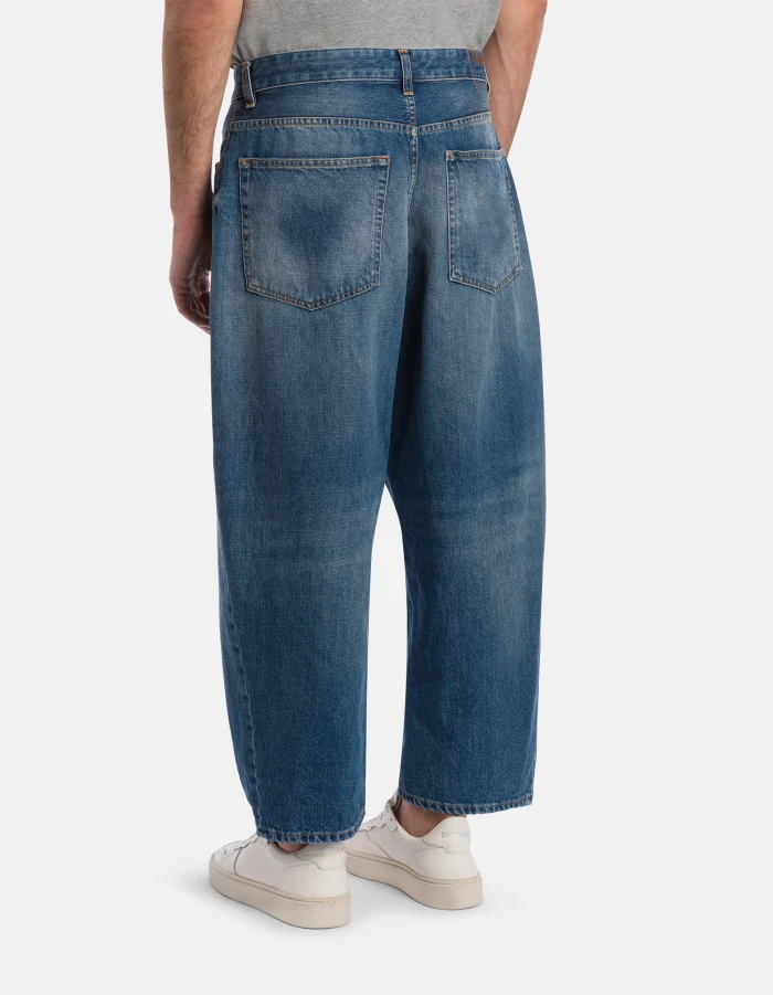 Anthony loose-fit 5-pocket jeans, low rise, dropped crotch, wide leg. Blue 13 oz salt & pepper rigid denim. Clean medium light vintage wash. Dondup logo. Made in Italy