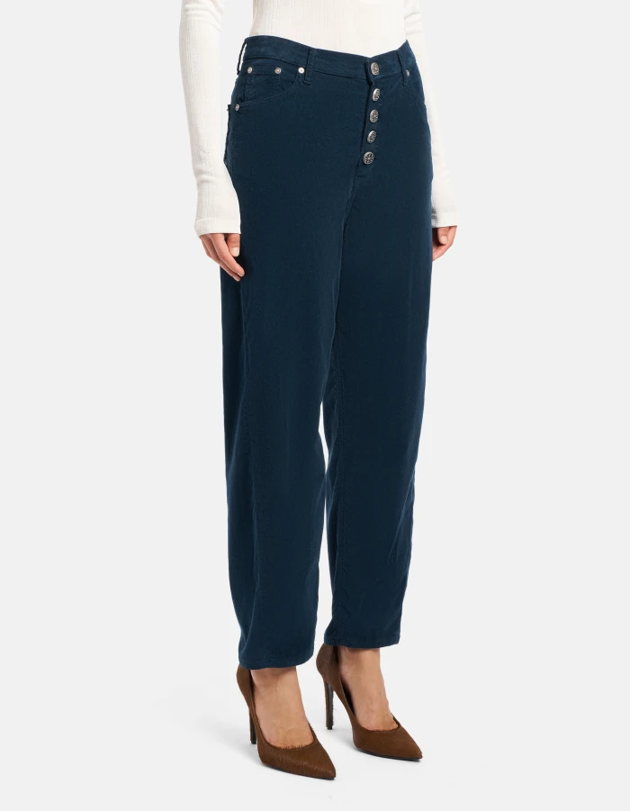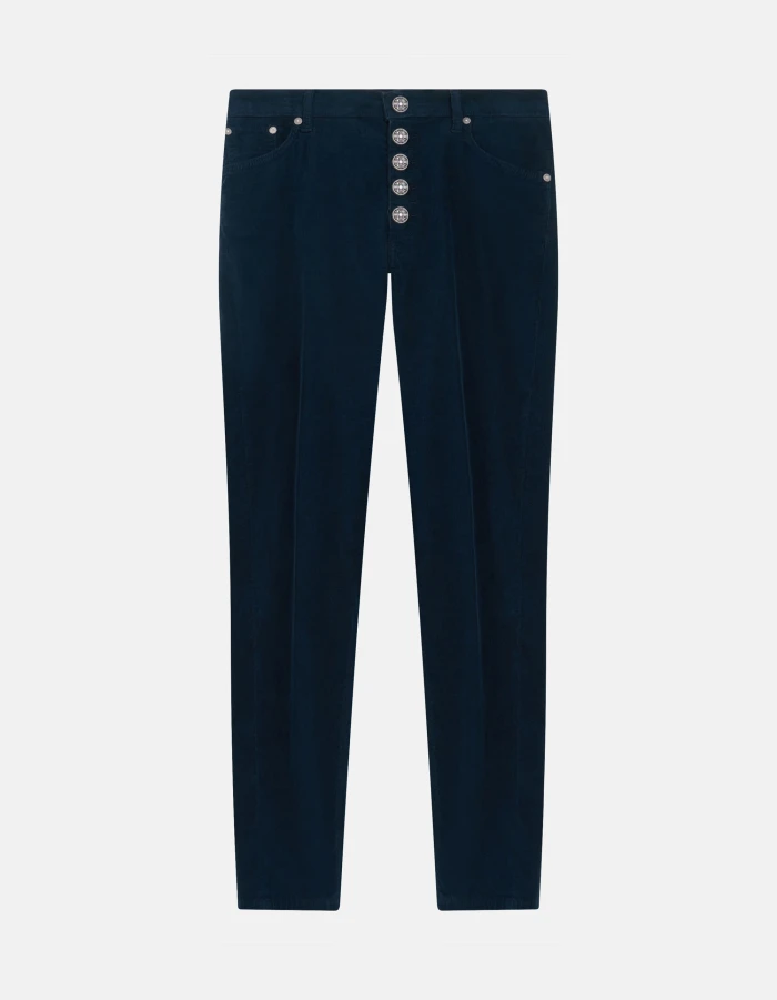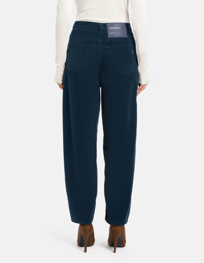 Bessie loose-fit five-pocket trousers, high waist. Jewel button fastening. Stretch cotton and lyocell velvet. Garment dyed. Dondup logo. Made in Italy