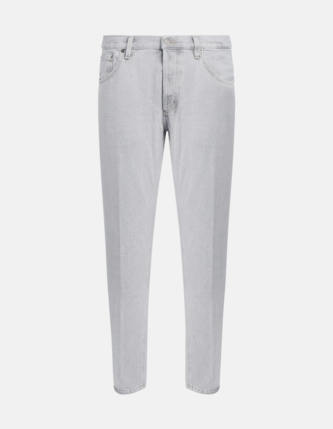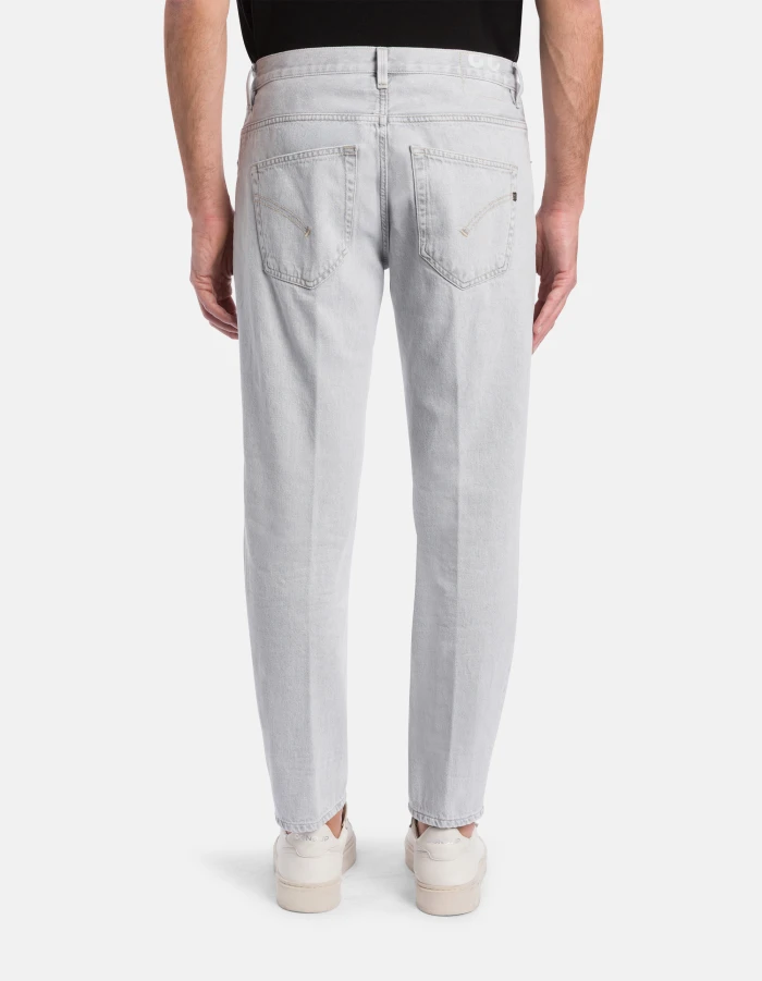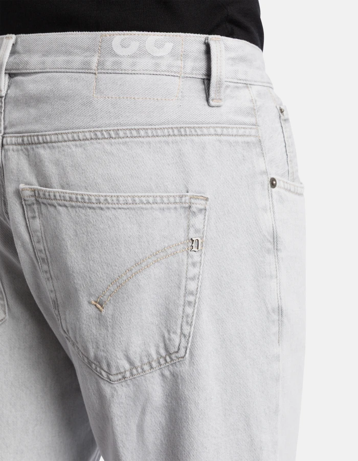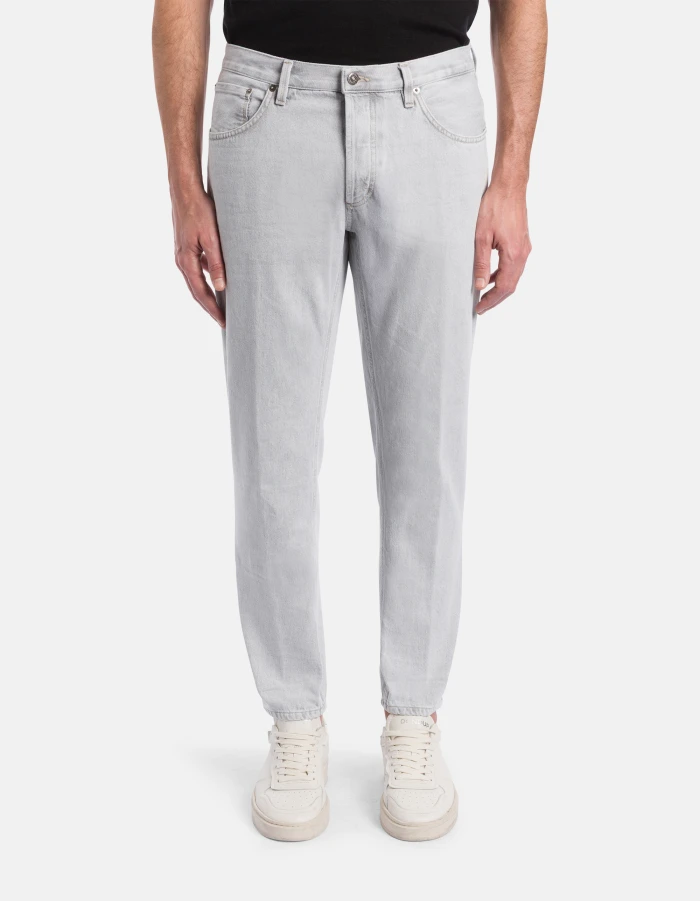 Brighton carrot-cut 5-pocket jeans, low rise. Grey 10.5 oz rigid denim. Light clean wash. Dondup logo. Made in Italy