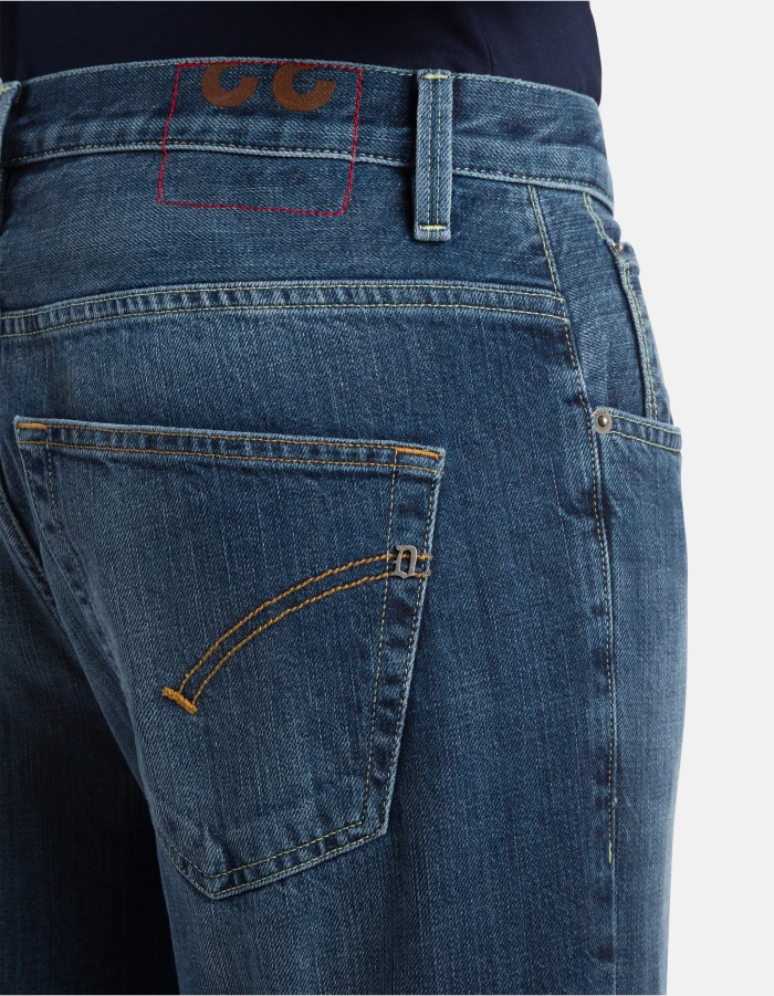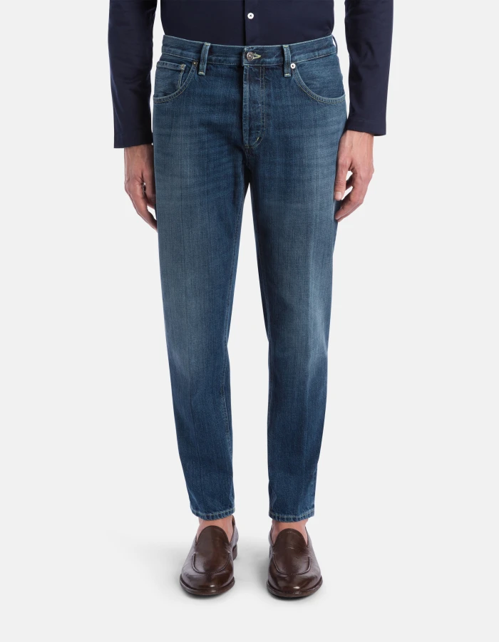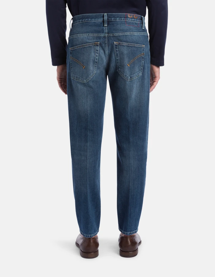 Brighton carrot-cut 5-pocket jeans, low rise. Blue cross 12.5 oz rigid denim. Medium-dark clean vintage wash. Dondup logo. Made in Italy
