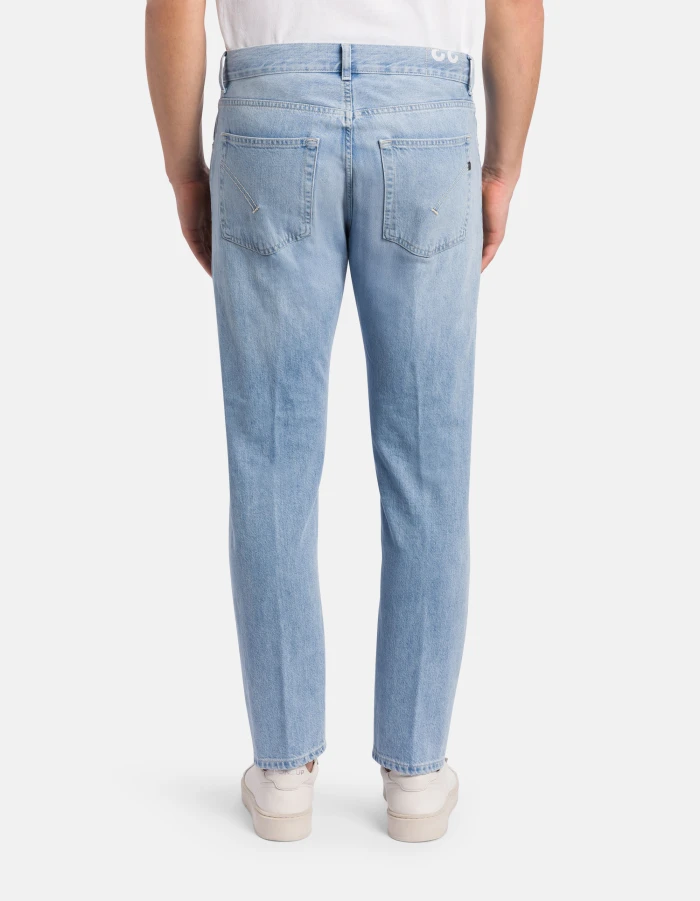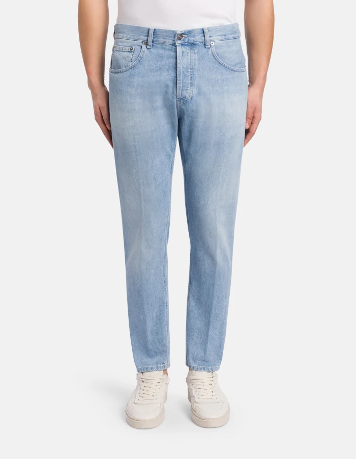 Dian slim-fit carrot-cut 5-pocket jeans, low rise. Blue 12.5 oz rigid cross denim. Light clean wash. Dondup logo. Made in Italy