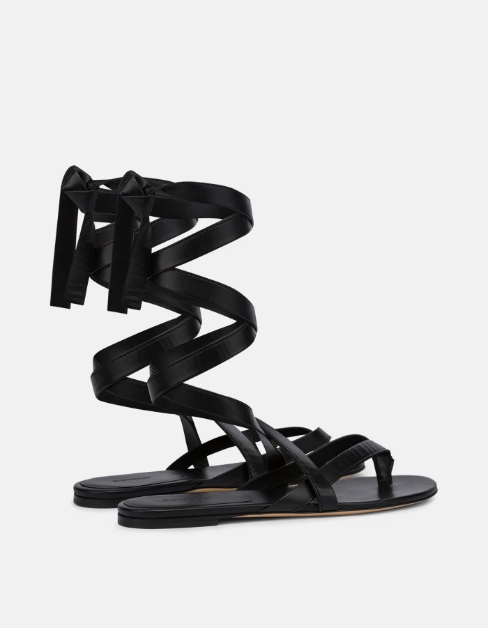 Flat sandals with ties and leather sole. Leather. Made in Italy