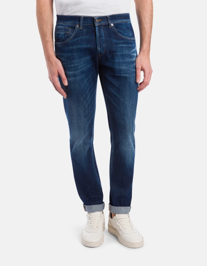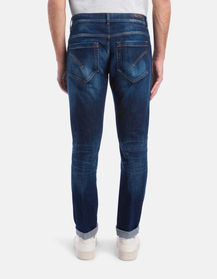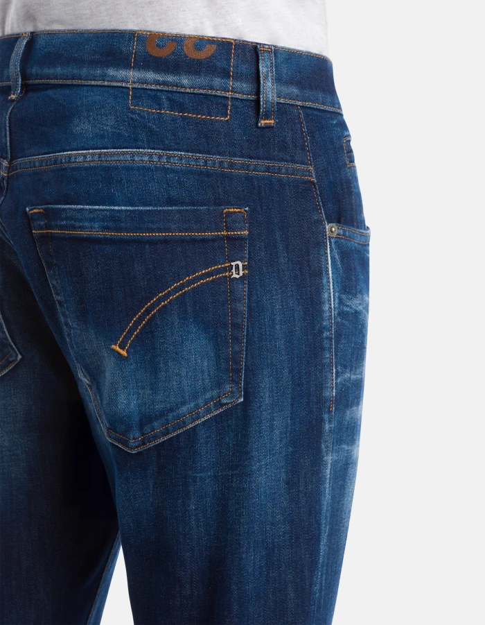 George skinny-fit 5-pocket jeans, low rise, small welt pocket. Blue 11 oz stretch denim. Vintage clean dark wash. Dondup logo. Made in Italy