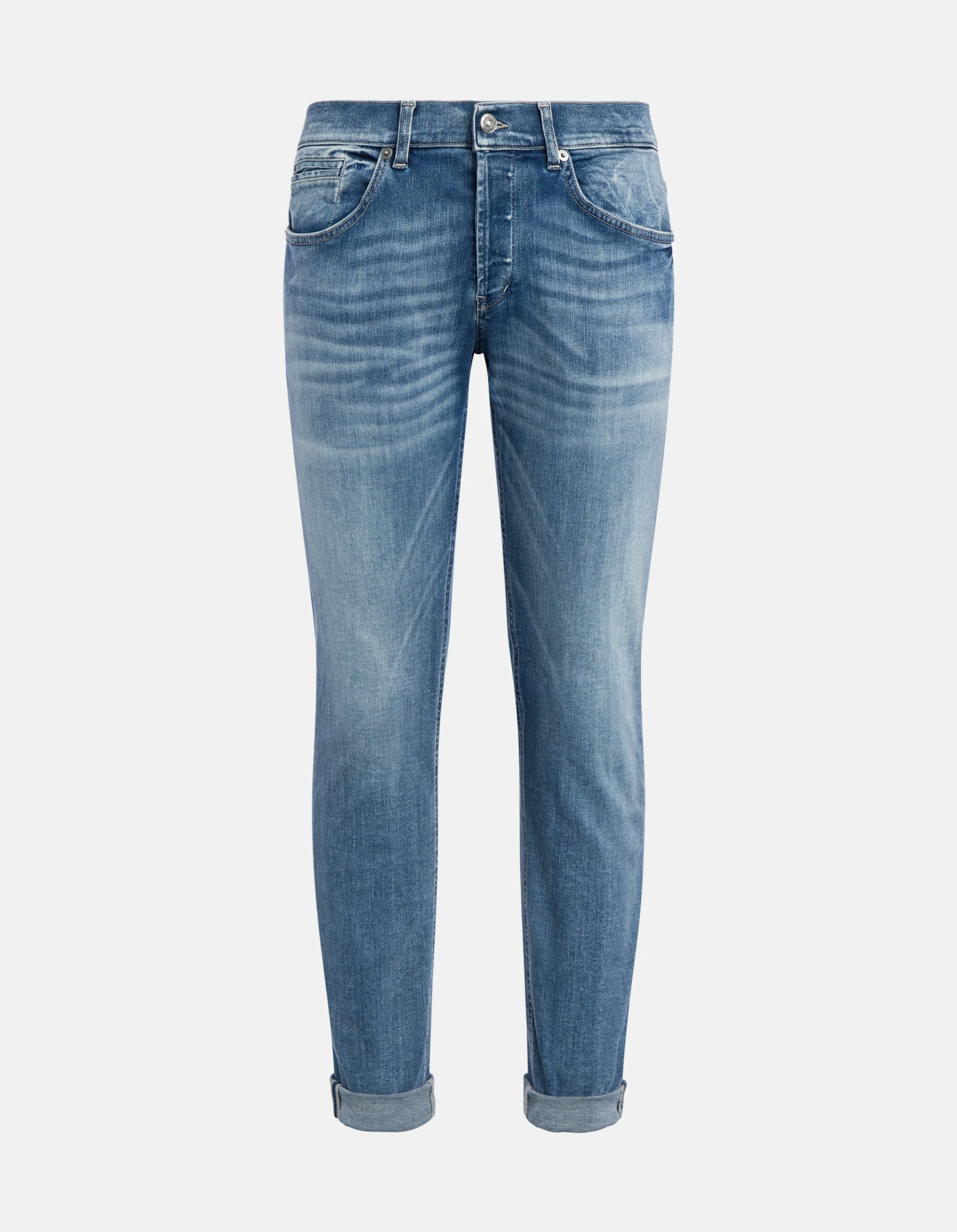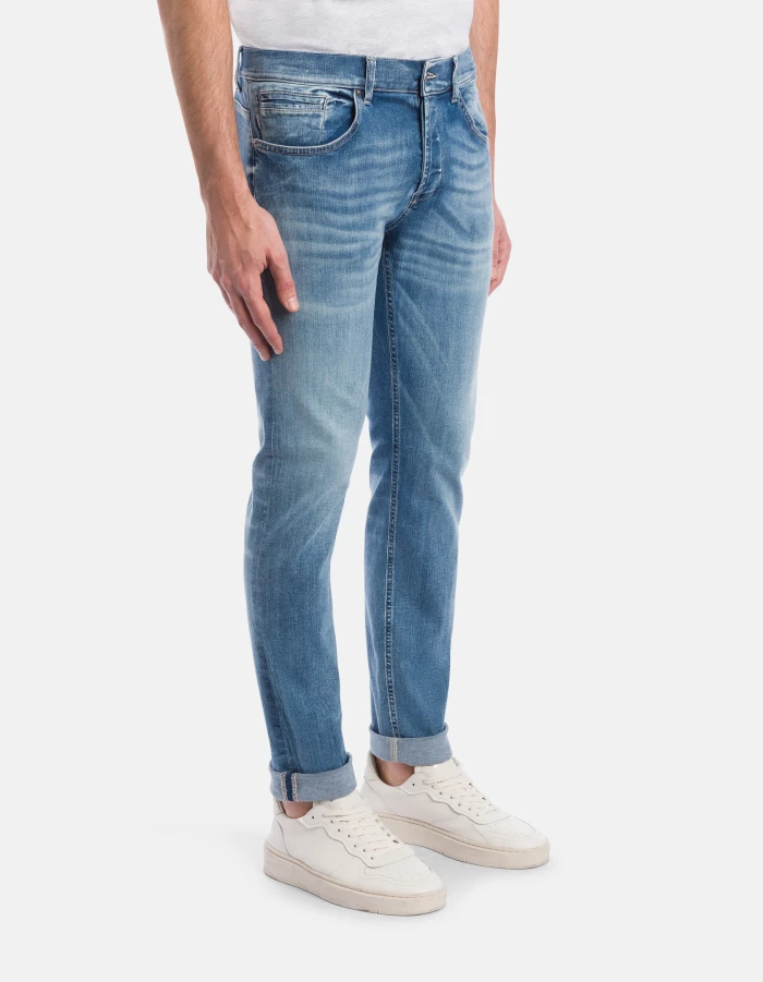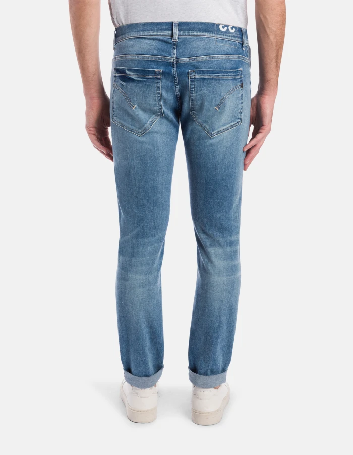George skinny-fit 5-pocket jeans, low rise, small welt pocket. Blue 11 oz high-stretch denim. Clean medium light vintage wash. Dondup logo. Made in Italy