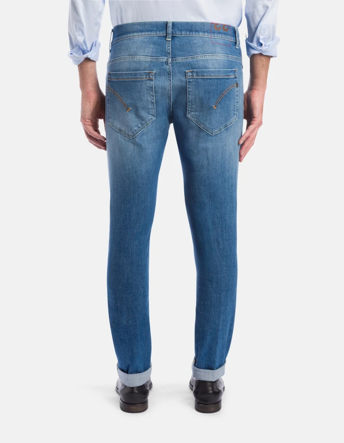 George skinny-fit 5-pocket jeans, low rise, small welt pocket. Blue 12 oz stretch denim Medium-light wash with rips. Dondup logo. Made in Italy