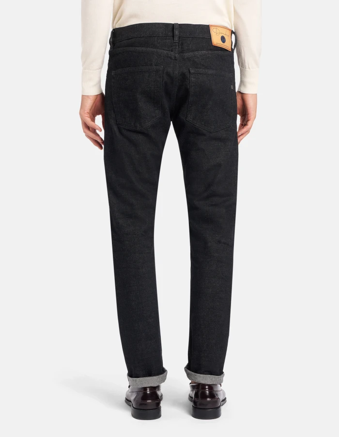 Icon regular-fit five-pocket jeans, regular waist. Black 14 oz rigid selvedge denim. Clean dark wash. Dondup logo. Made in Italy