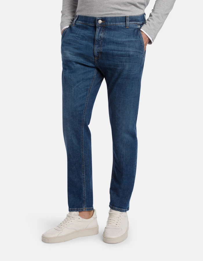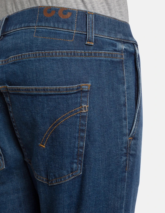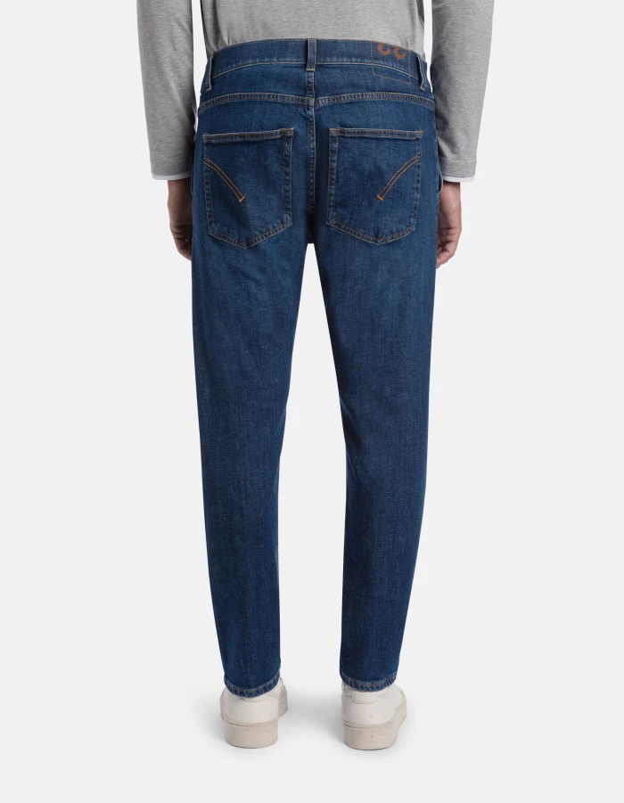Jeff carrot-cut 5-pocket jeans, low rise, slanted pockets. Blue 11.5 oz sustainable stretch denim. Clean medium-dark GOTS wash. Dondup logo. Made in Italy