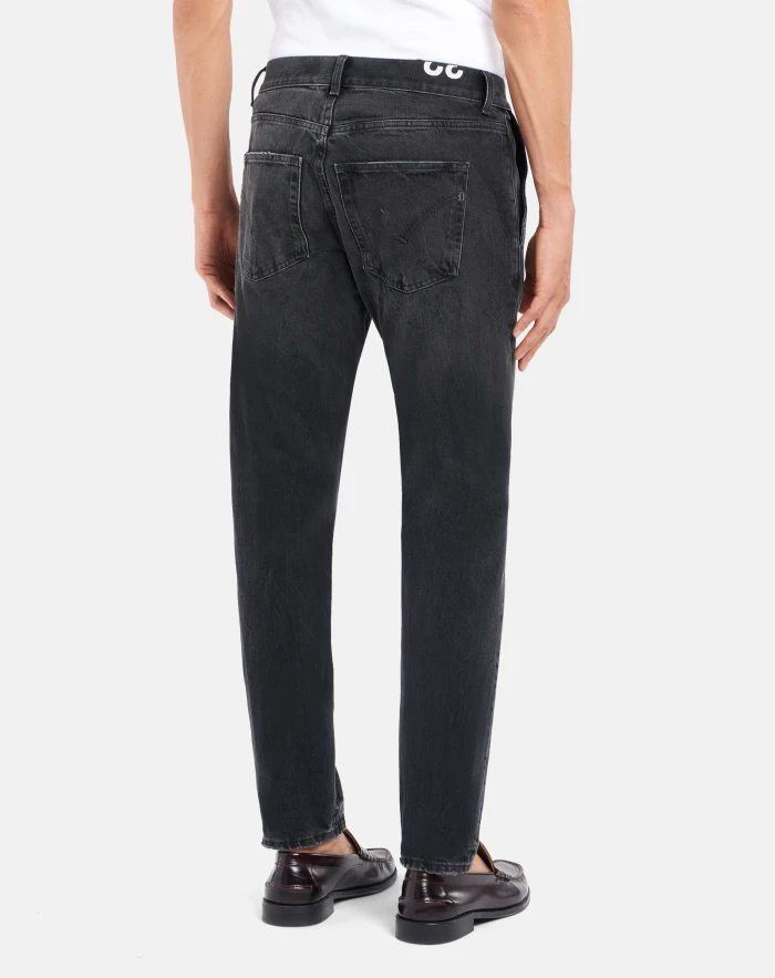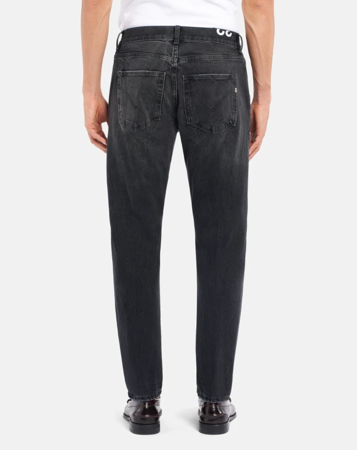 Jeff carrot-fit five-pocket jeans, low waist, slanted pockets. Black black 14 oz rigid denim. Vintage clean black wash. Dondup logo. Made in Italy