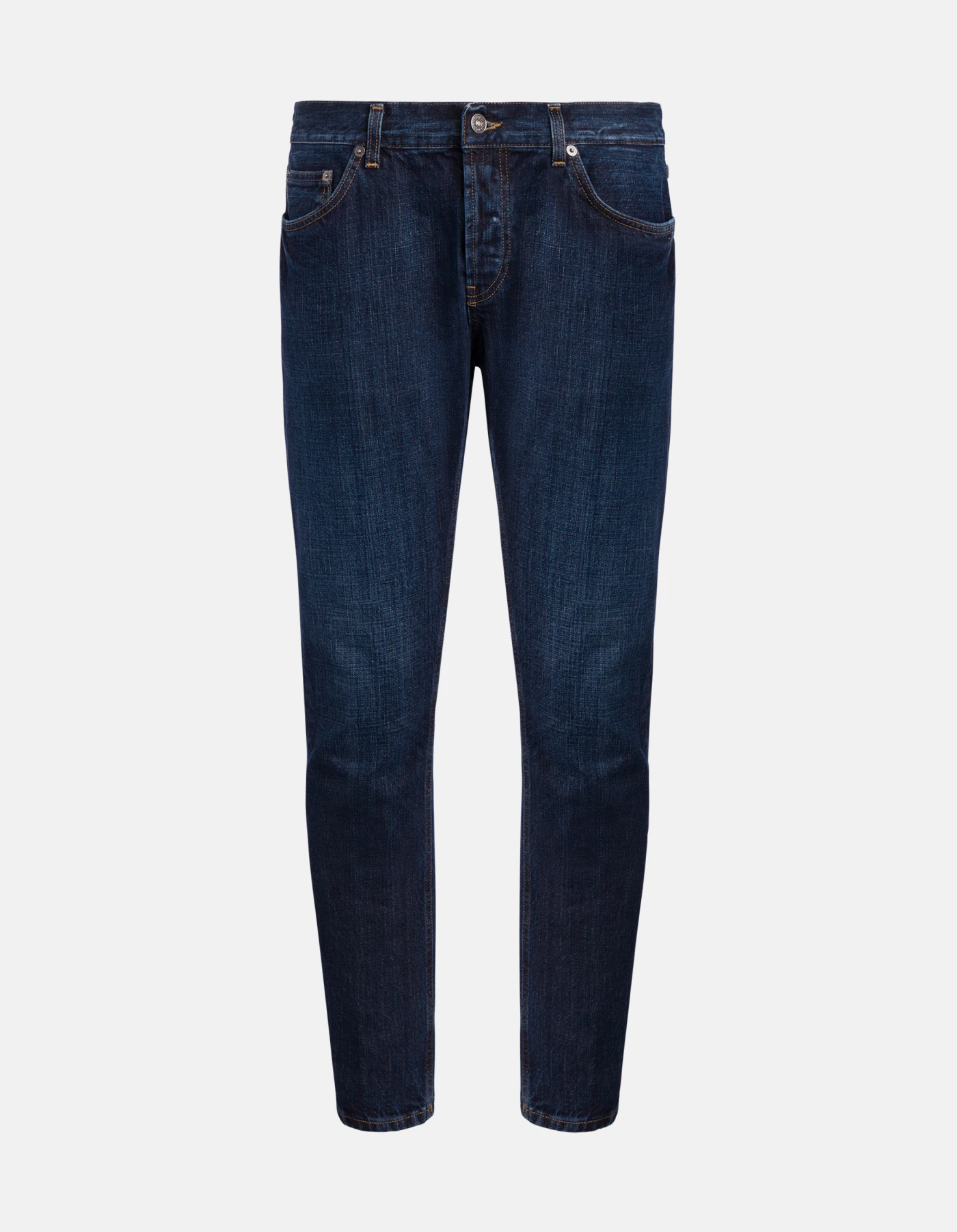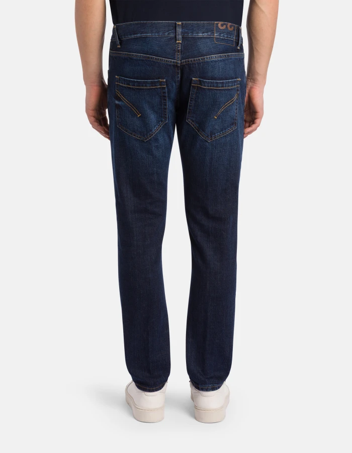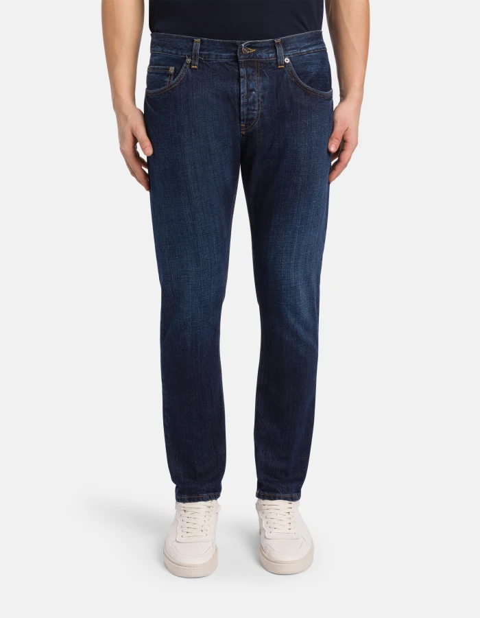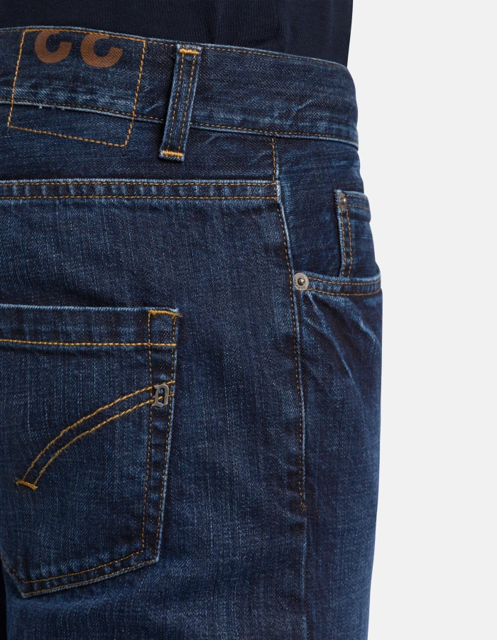 Mius slim-fit 30-inch five-pocket jeans, low waist. Blue 12.5 oz rigid cross denim. Vintage dark clean wash. Dondup logo. Made in Italy