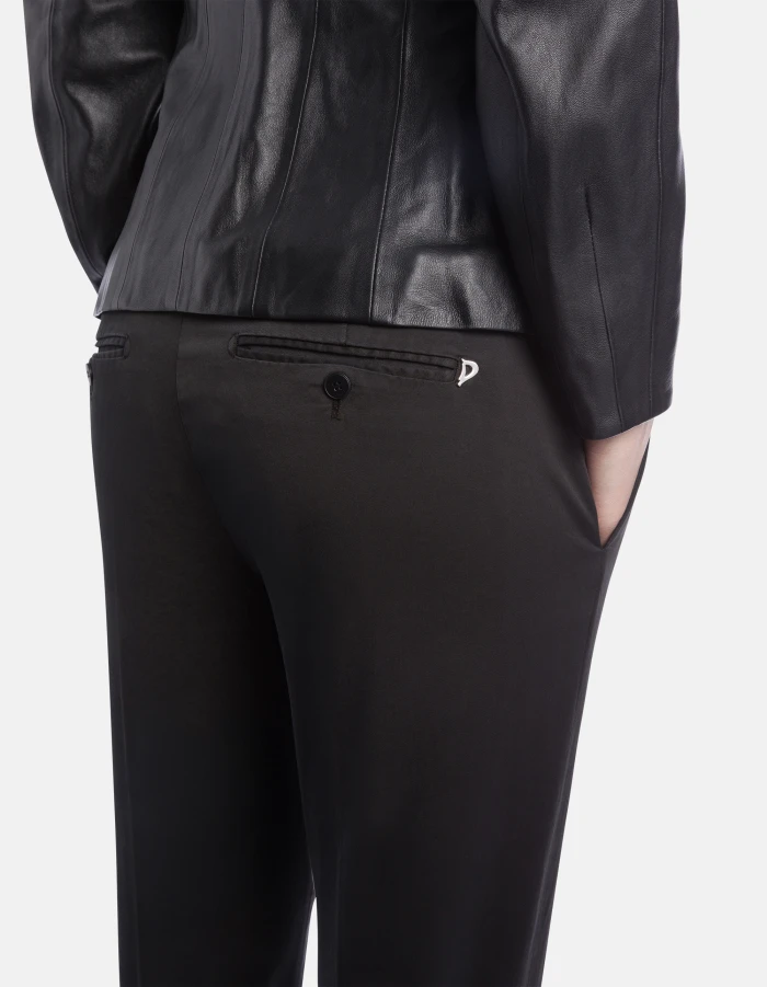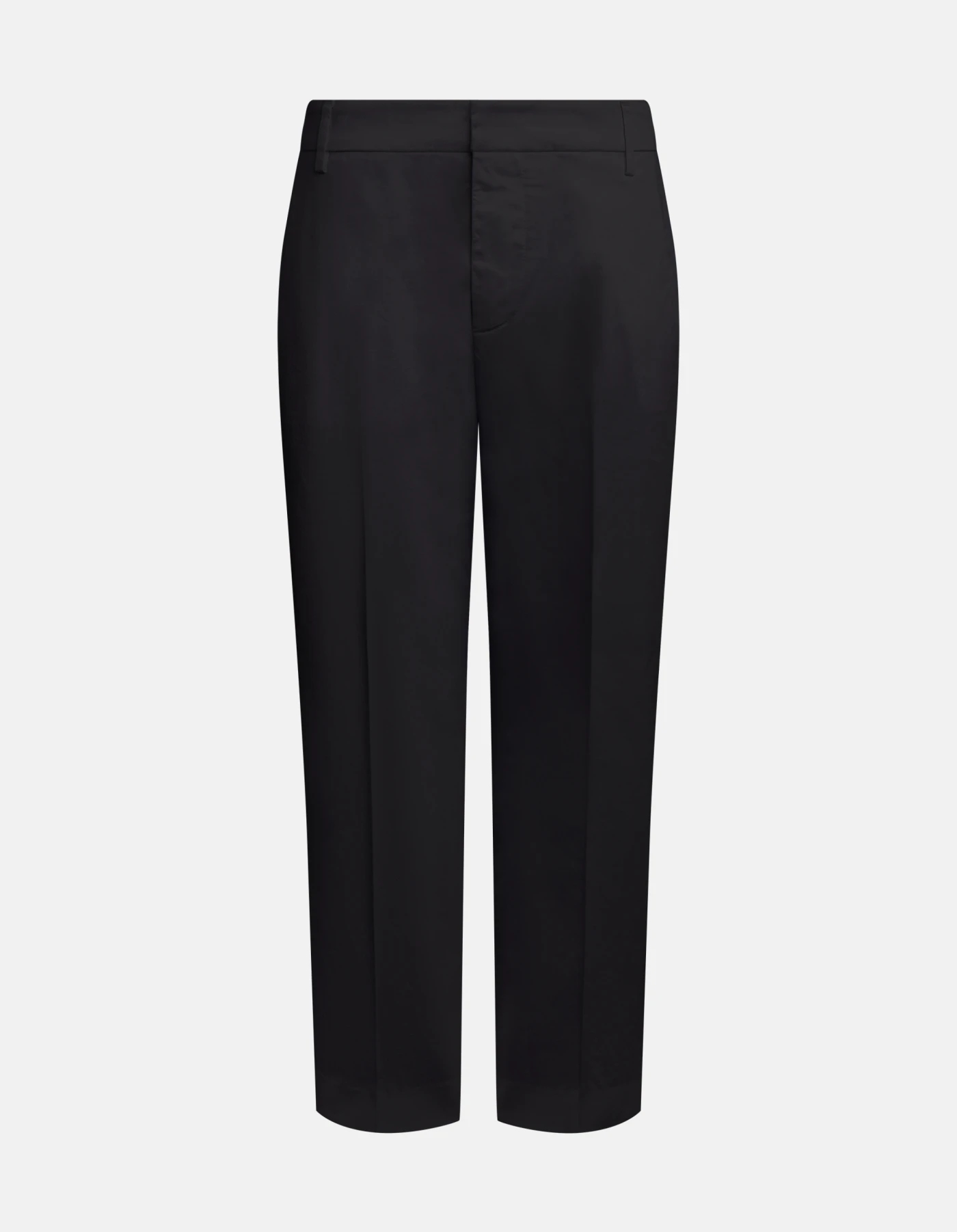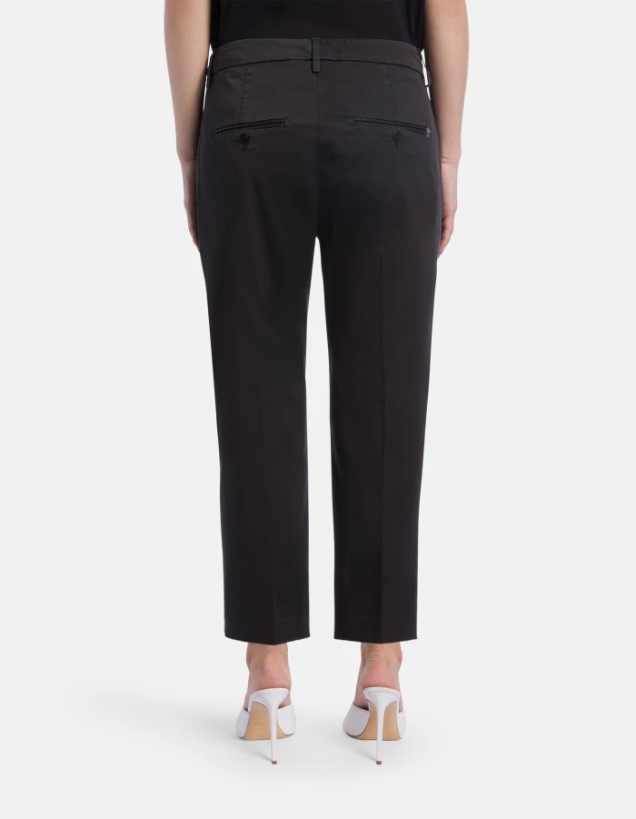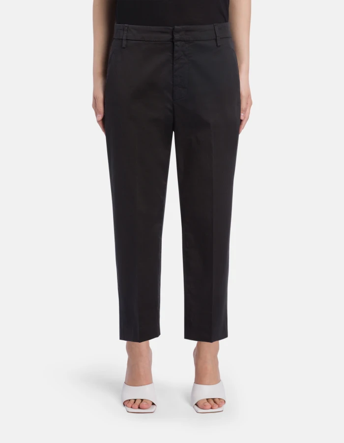 Nima loose-fit cropped chinos, regular waist, zipped flap pocket, welt pockets at the back. Stretch compact gabardine. Garment dyed. Dondup logo. Made in Italy