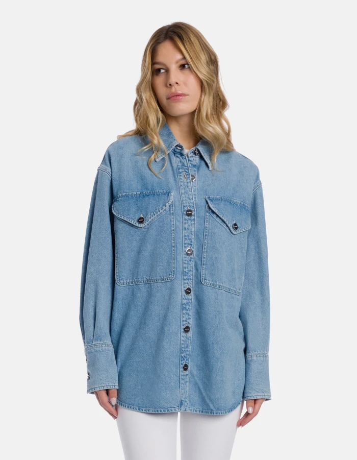 Oversized shirt with large pockets with flaps on the front and button fastening. Blue 10.5 oz cotton and lyocell rigid denim. Light clean wash. Dondup logo. Made in Italy