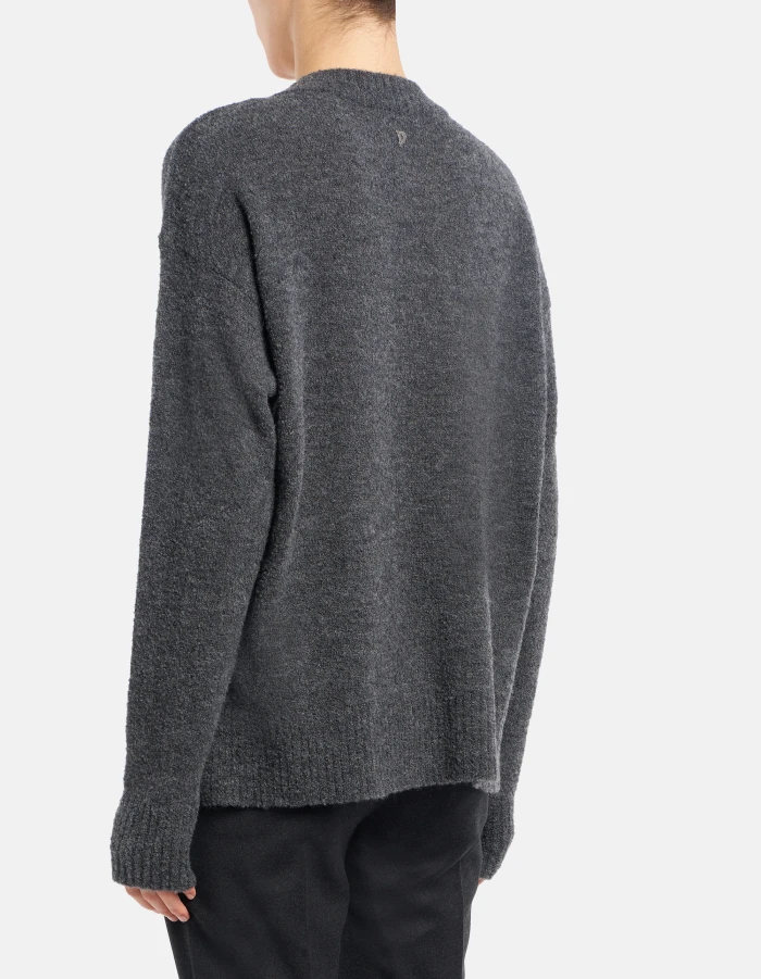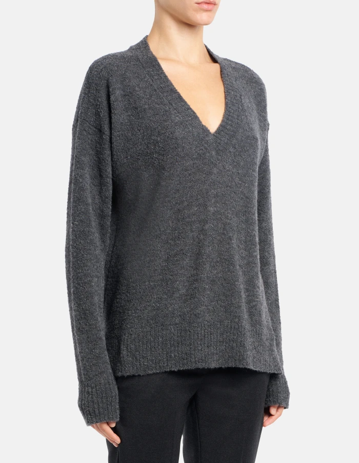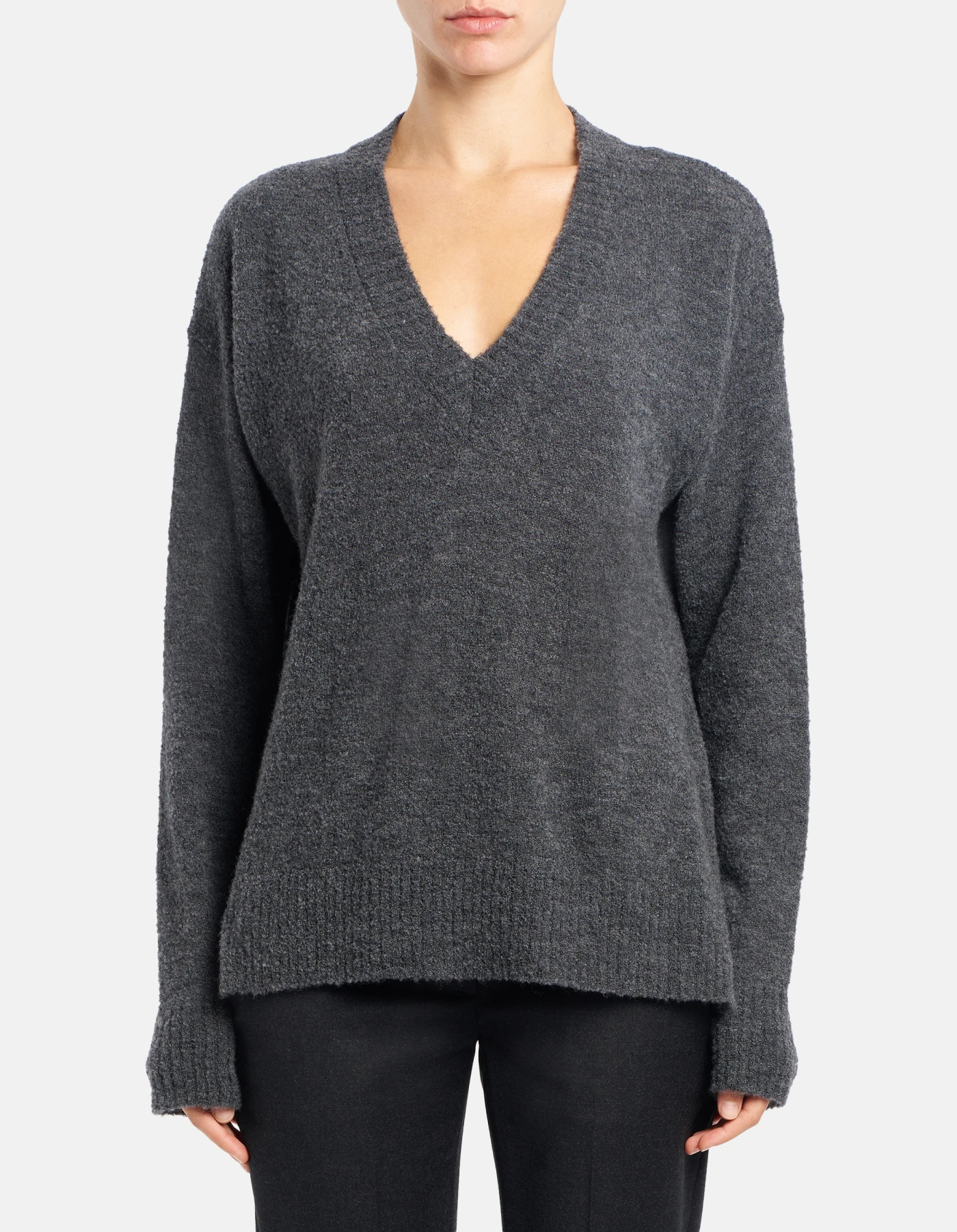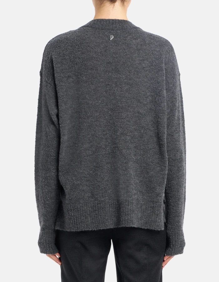 Oversized V-neck jumper with long sleeves and ribbed hemline and cuffs. Bouclé. Dondup logo. Made in Italy