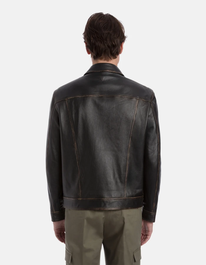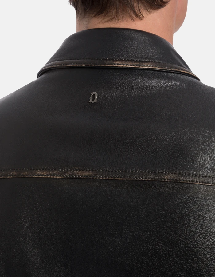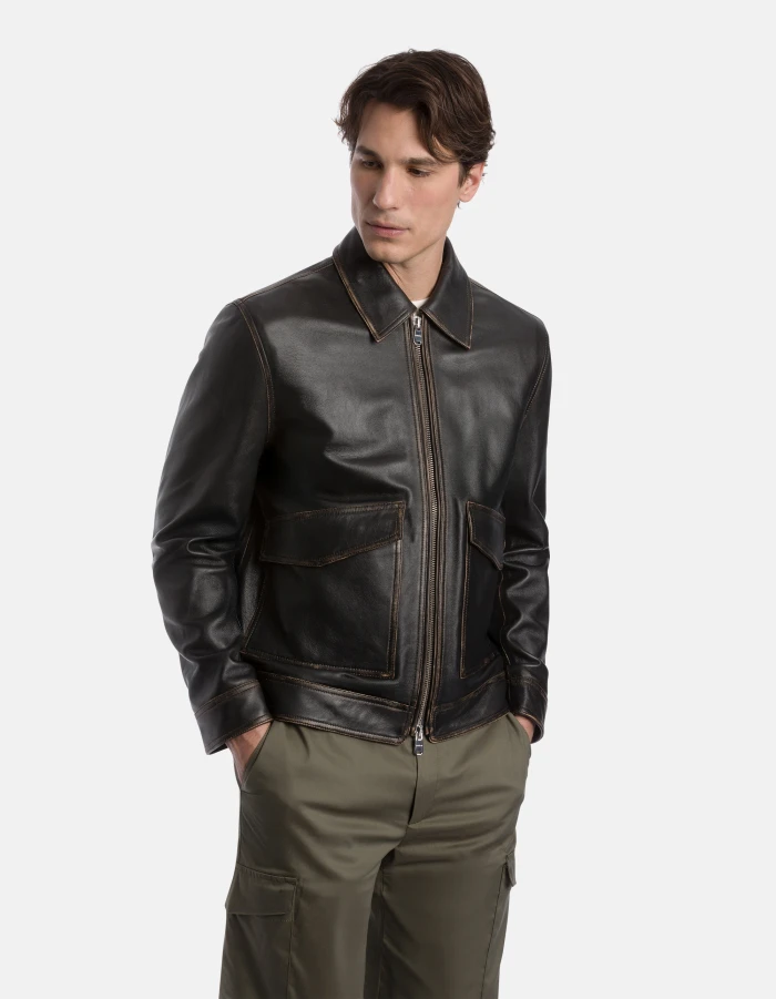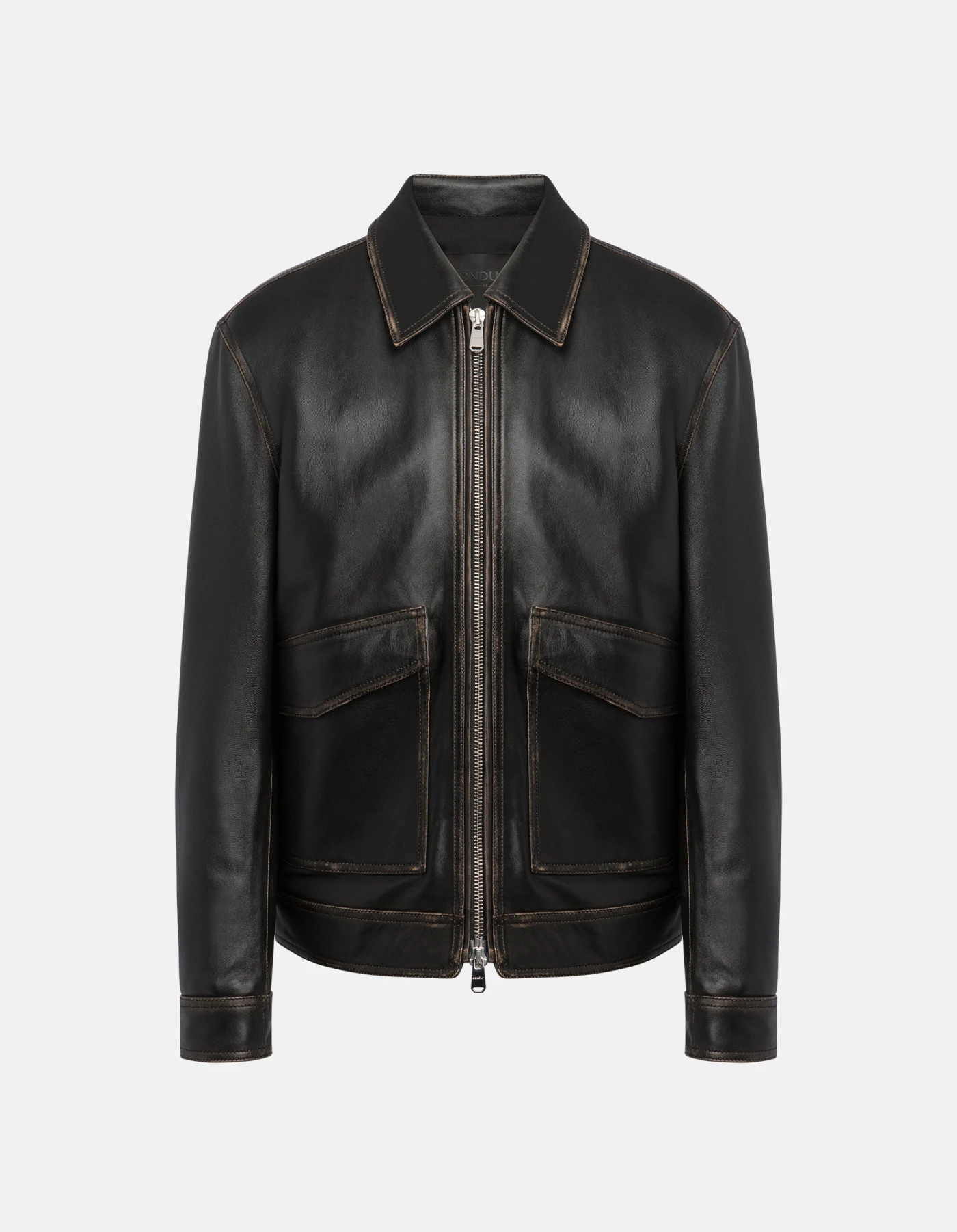 Regular-fit biker jacket with shirt collar, patch pockets with pointed flap, lined. Metal zip fastening. Used-effect nappa leather. Dondup logo. Made in Italy