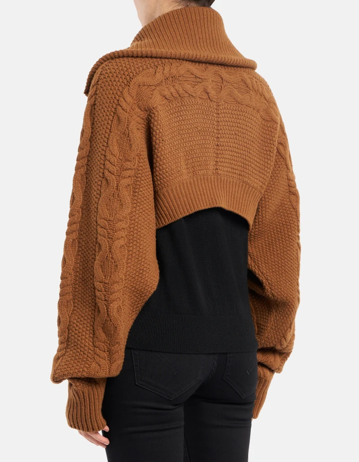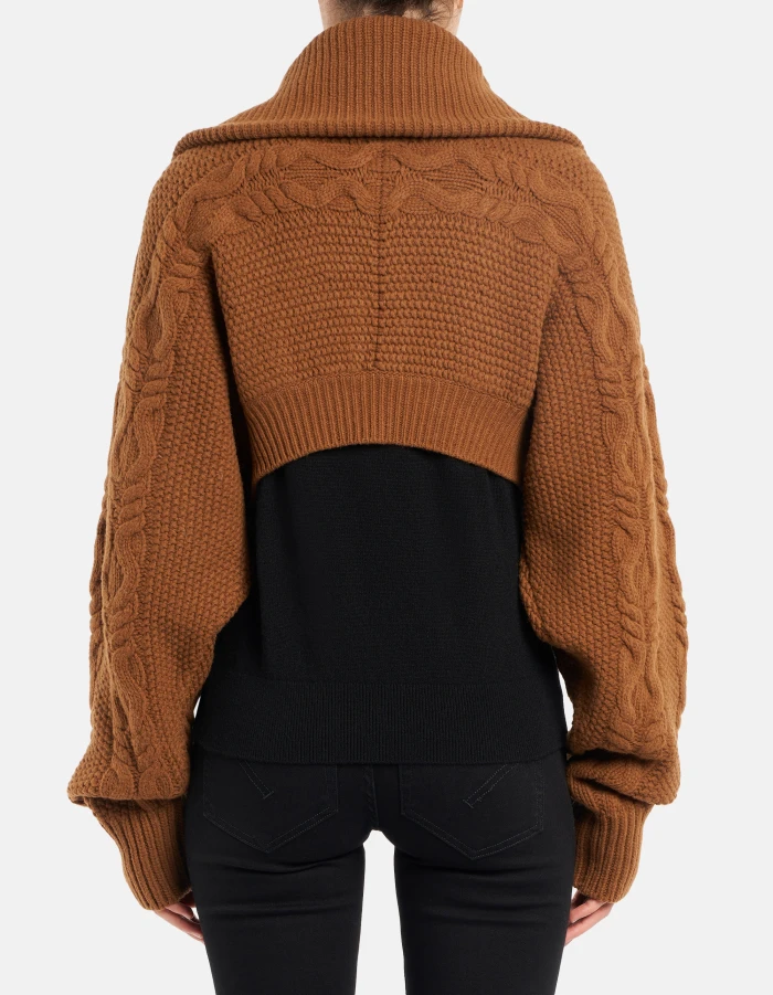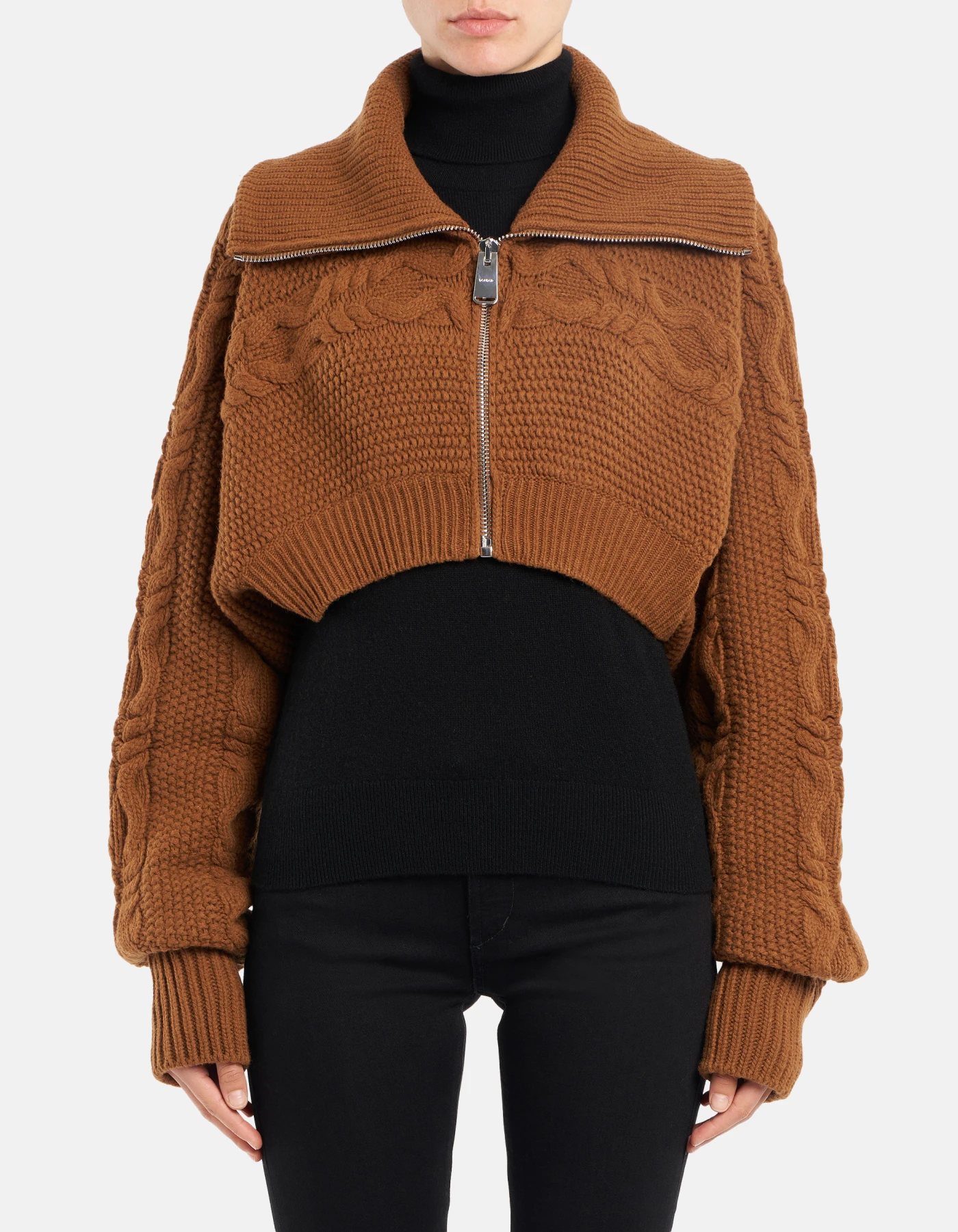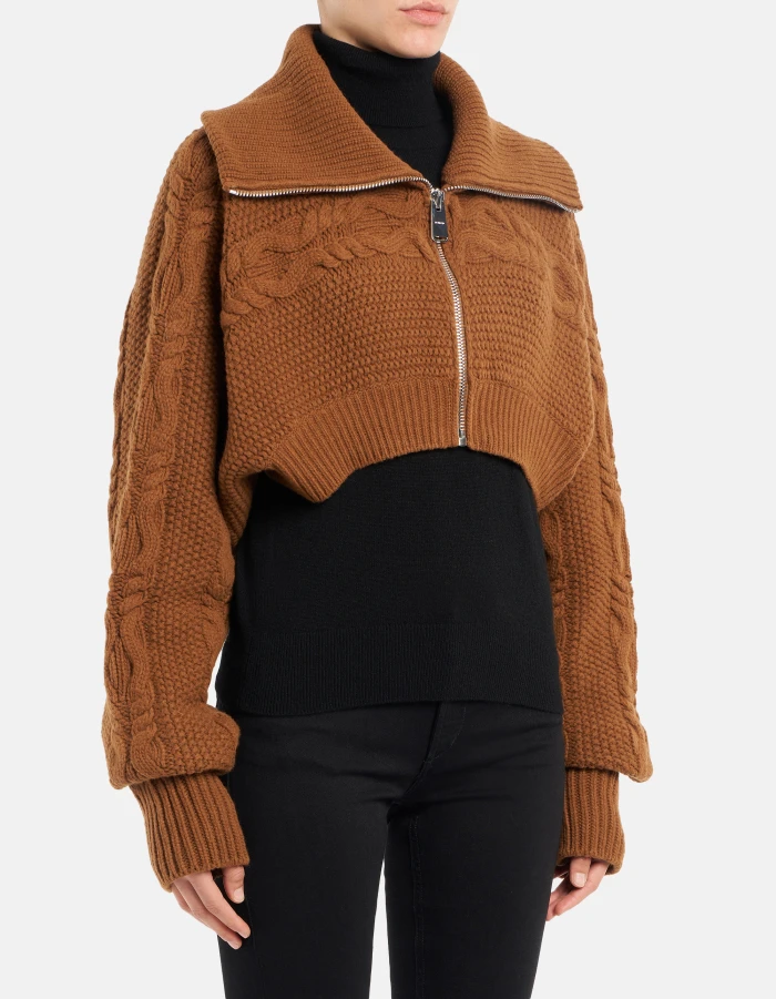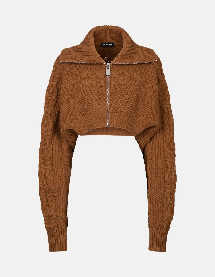 Regular-fit cropped cardigan with long sleeves. Zip closure and high collar. Logo applique at the back. Varied knit patterns. Dondup logo. Made in Italy