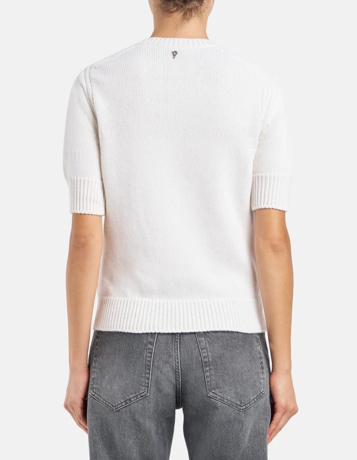 Regular-fit crew-neck jumper with short sleeves, ribbed sides, armholes and shoulders. Logo applique at the back. Smooth. Dondup logo. Made in Italy