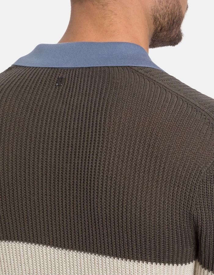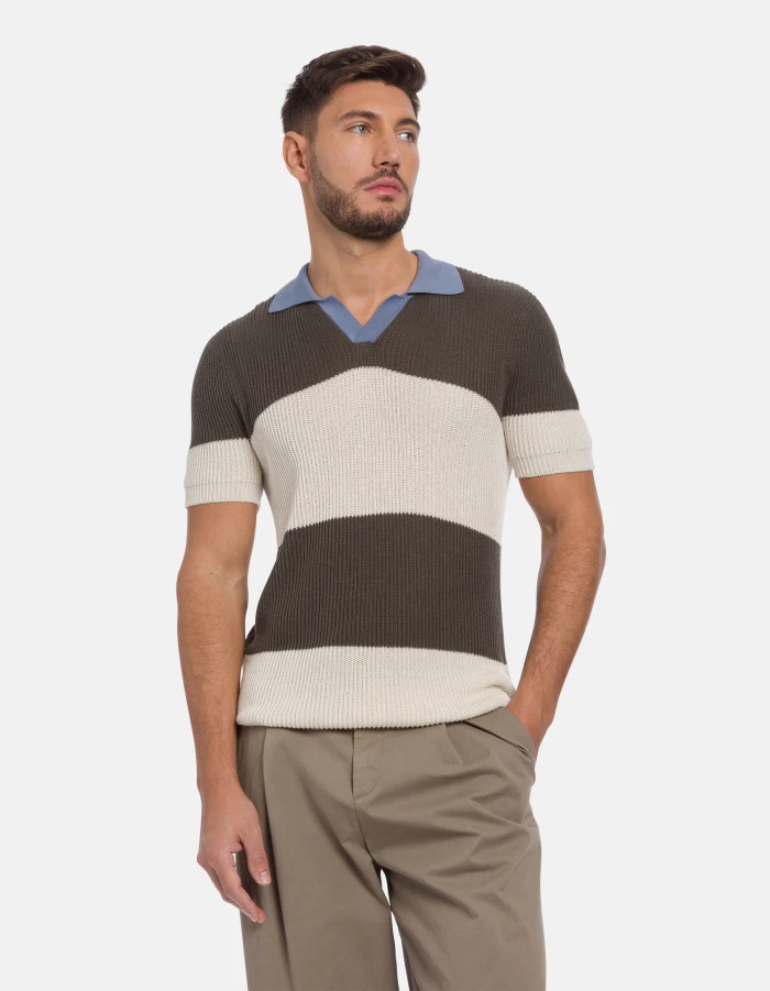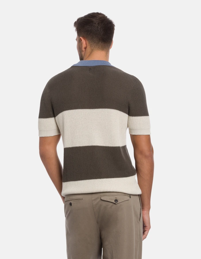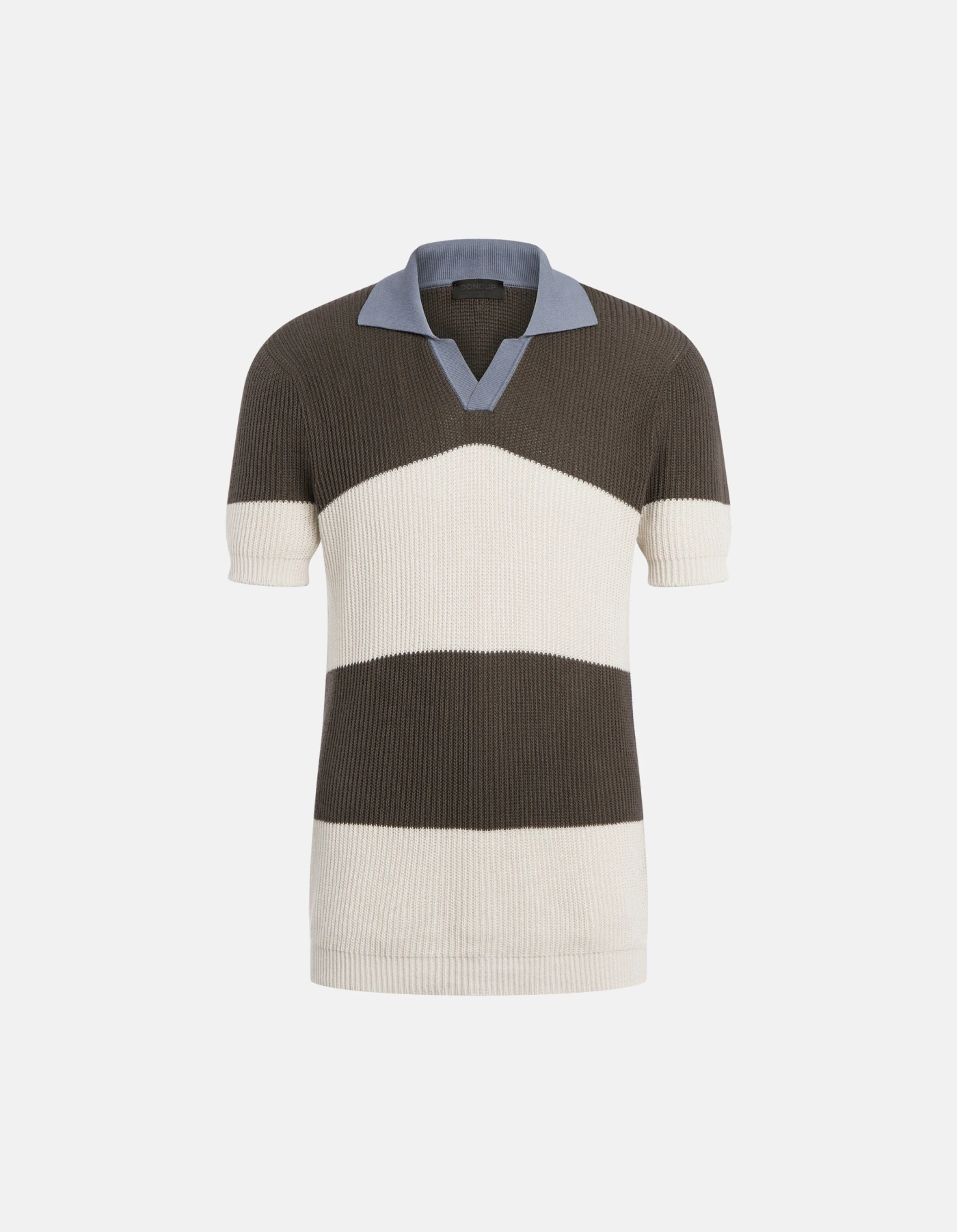 Regular-fit short-sleeved polo shirt with contrasting collar and logo appliqué on the back. Striped fisherman’s rib. Dondup logo. Made in Italy