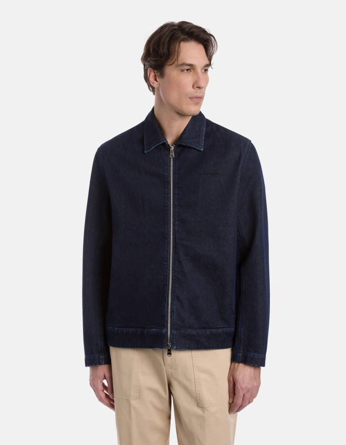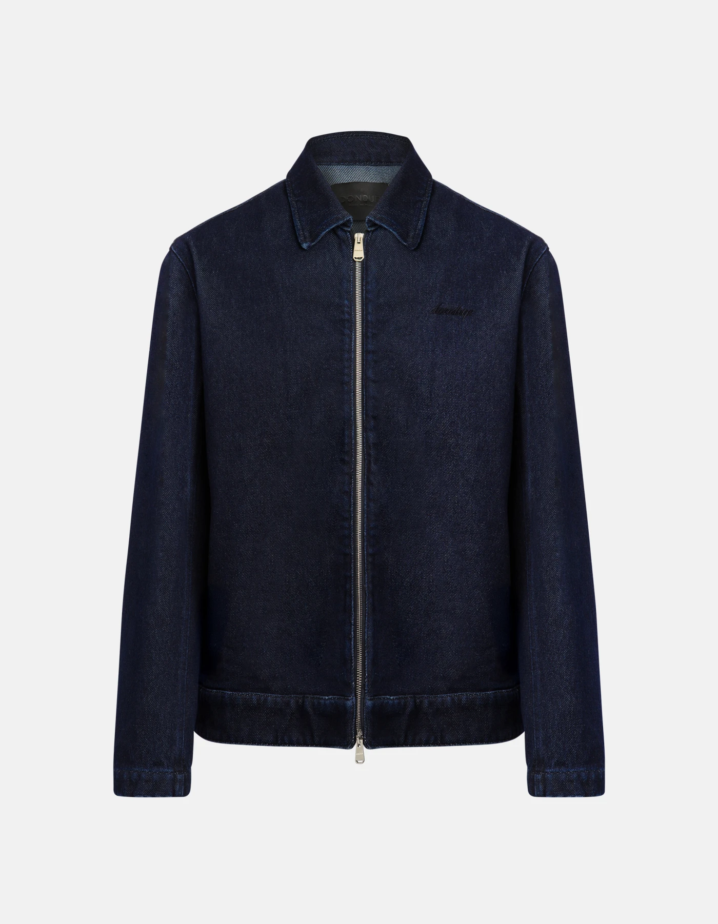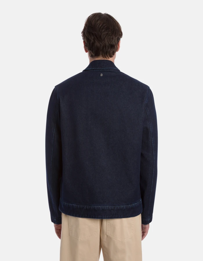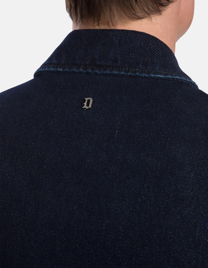 Regular-fit jacket with shirt collar, side welt pockets, logo embroidery on the chest, unlined. Metal zip fastening. Blue 18 oz recycled rigid denim. Clean dark wash. Dondup logo. Made in Italy
