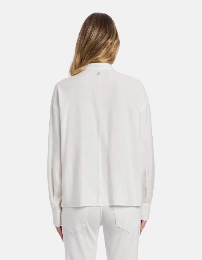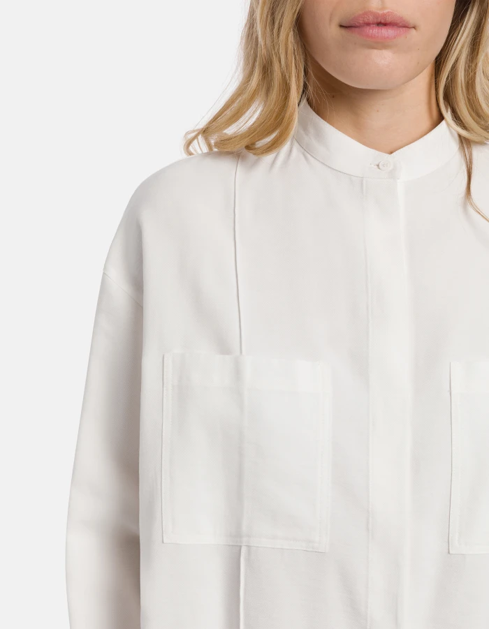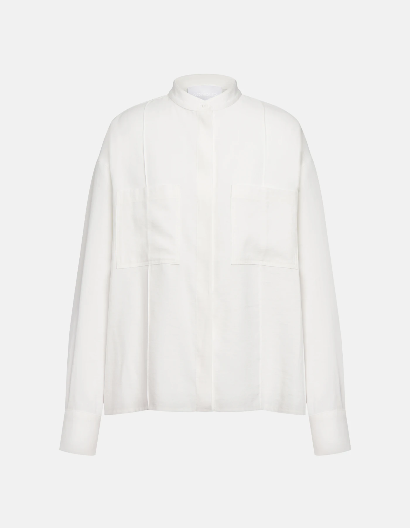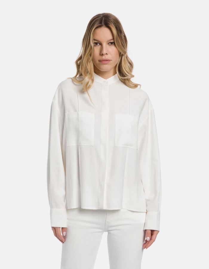 Regular-fit long-sleeved shirt with concealed button placket, mandarin collar, pockets and front ribbing. Viscose gabardine. Dondup logo. Made in Italy