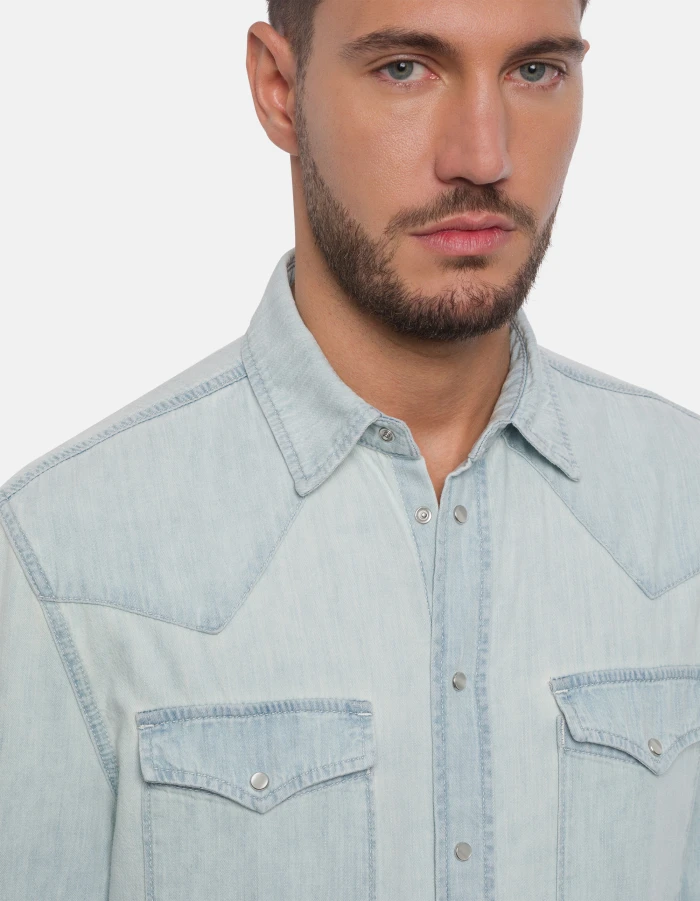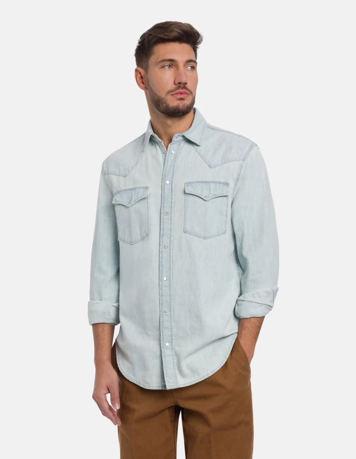 Regular-fit Western-style shirt with pointed yoke at the front, yoke at the back, flap breast pockets and snap-button fastening. Blue 7 oz rigid denim. Light wash. Dondup logo. Made in Italy