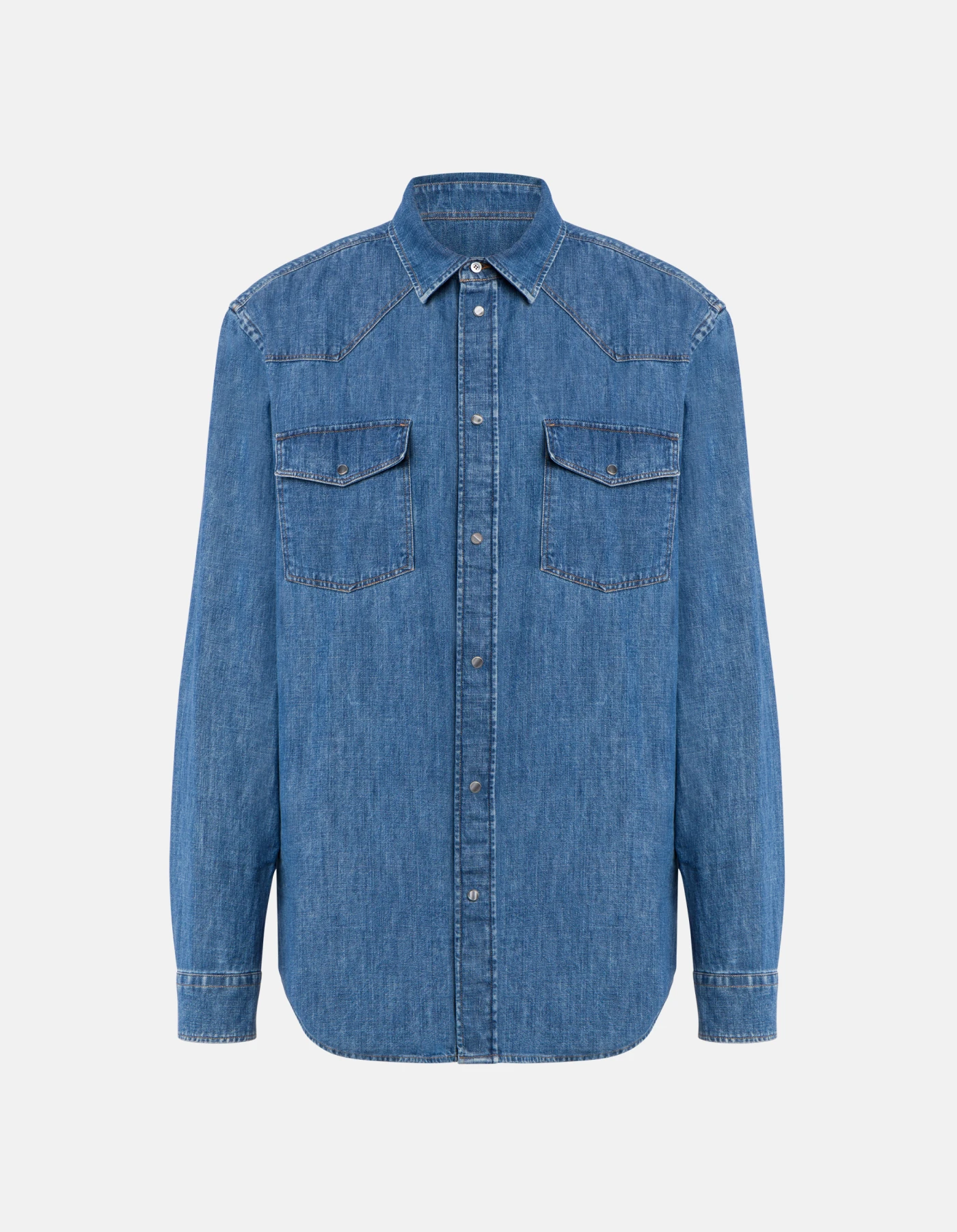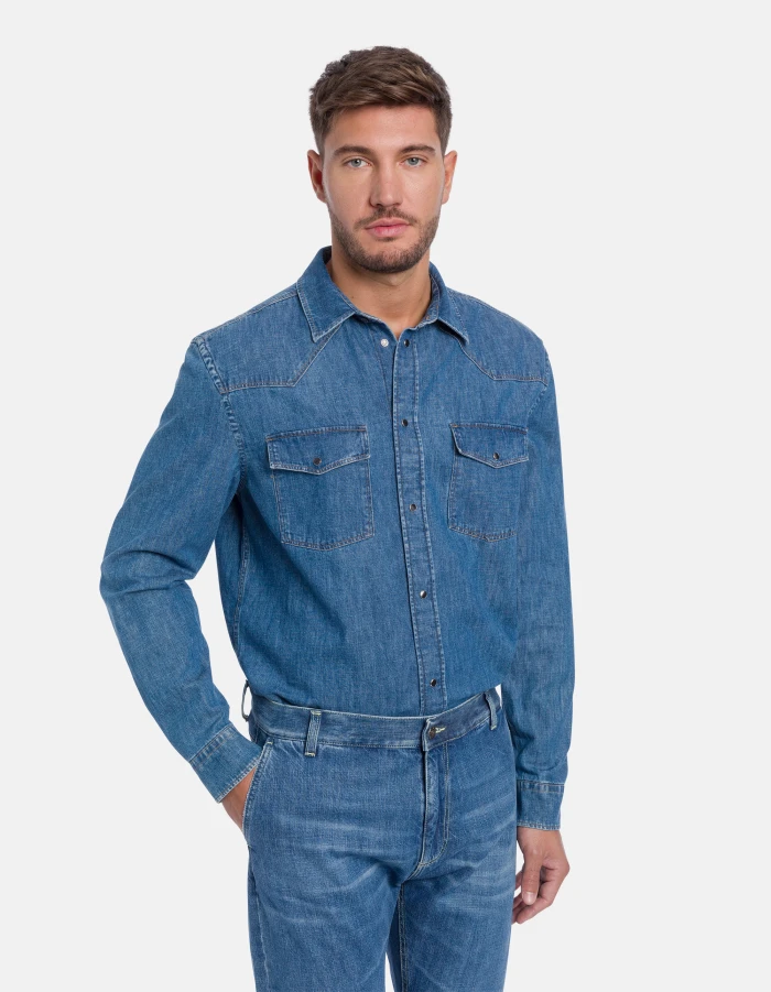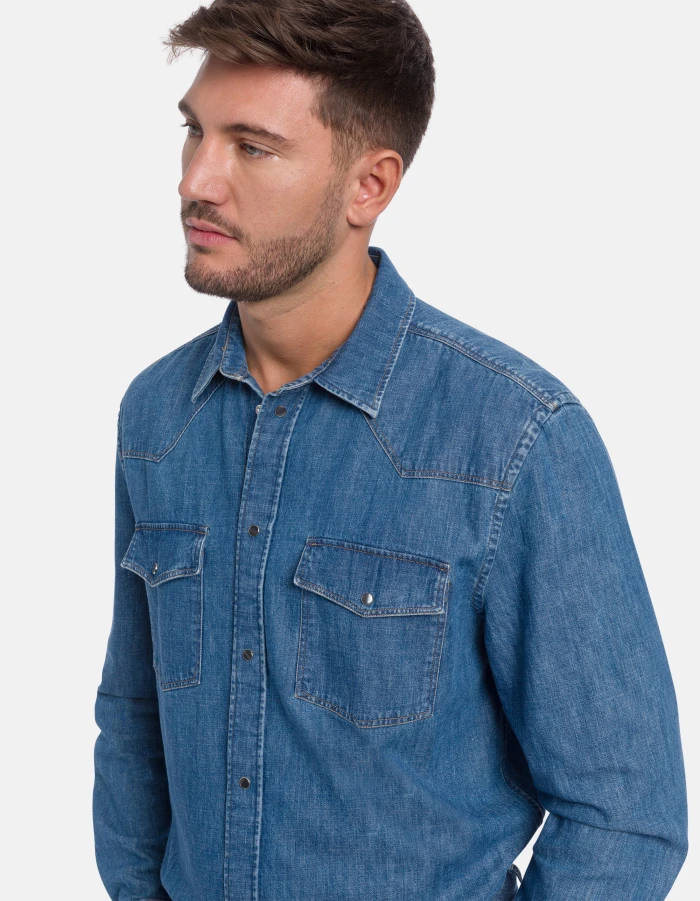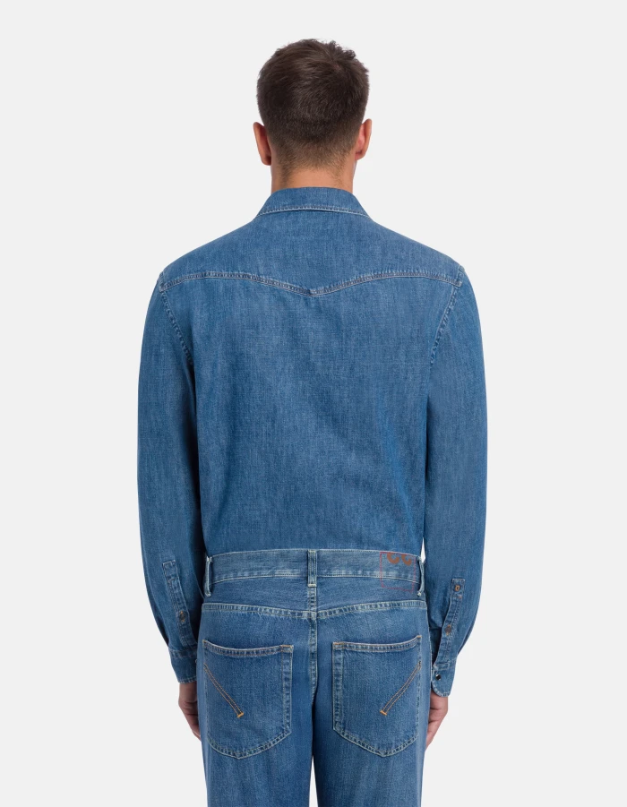 Regular-fit Western-style shirt with pointed yoke at the front, yoke at the back, flap breast pockets and snap-button fastening. Blue 7 oz rigid denim. Clean medium wash. Dondup logo. Made in Italy