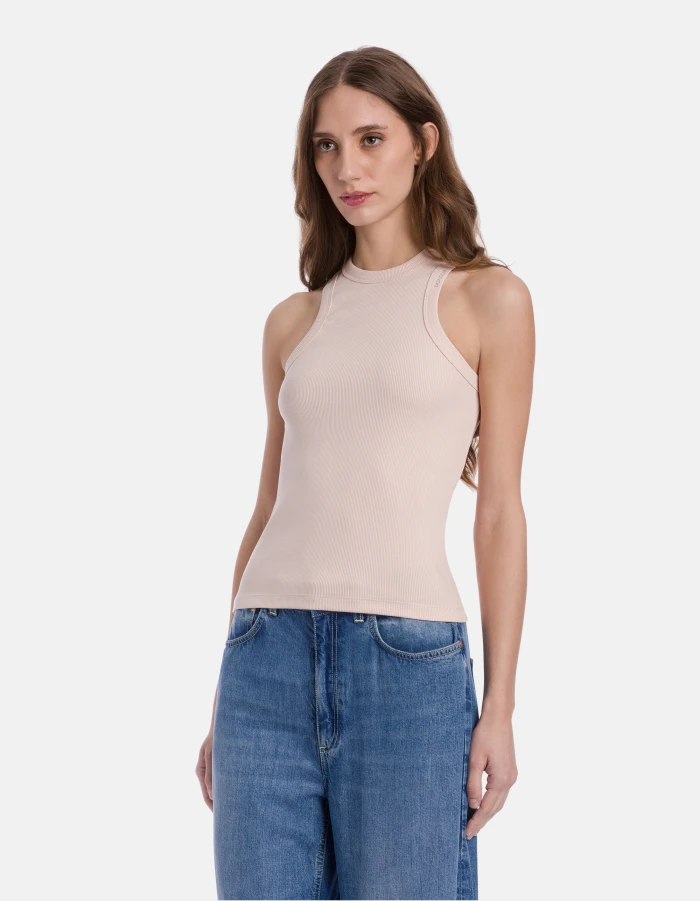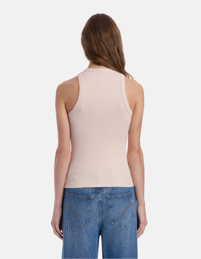 Slim-fit crew-neck vest with halter neck and embroidered logo on the left shoulder. Ribbed cotton. Dondup logo. Made in Italy