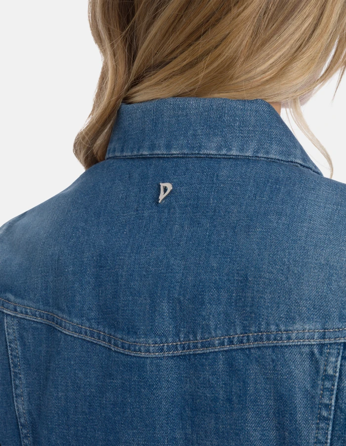 Slim-fit 5-pocket jacket with stud-button fastening. Light blue 11.25 oz rigid denim Clean medium wash. Dondup logo. Made in Italy