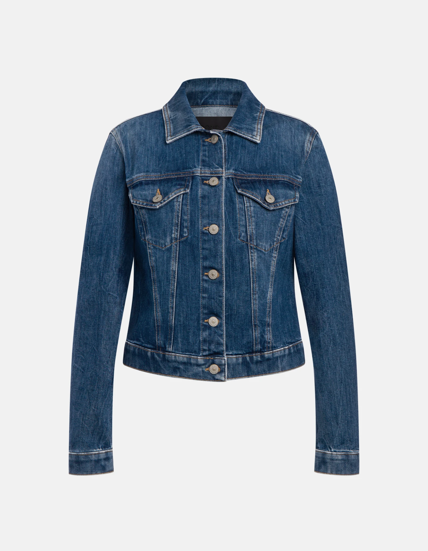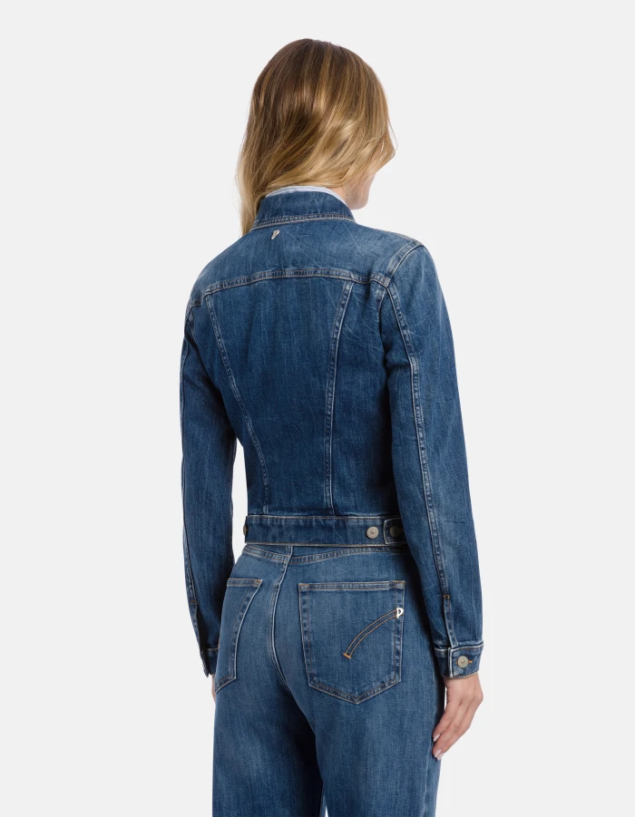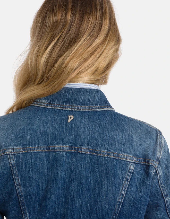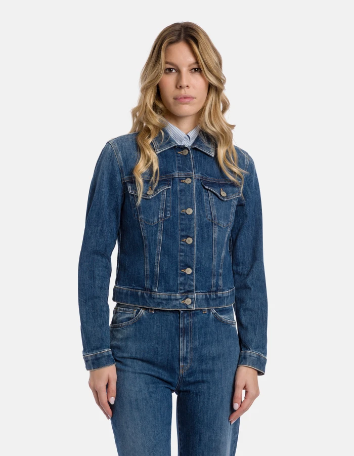 Slim-fit 5-pocket jacket with stud-button fastening. Blue 11 oz stretch denim. Vintage clean medium-dark wash. Dondup logo. Made in Italy