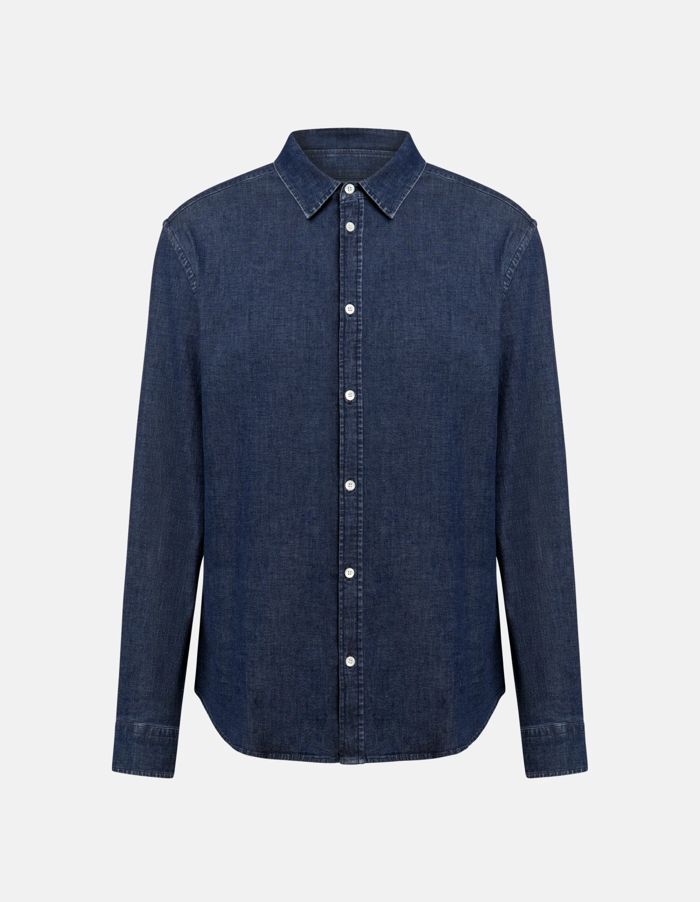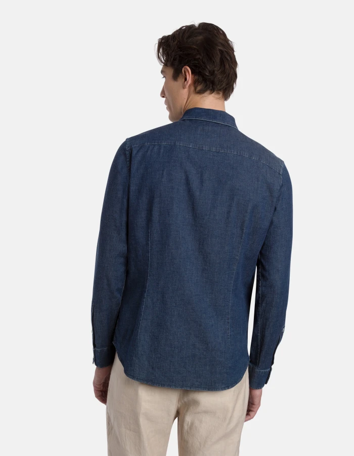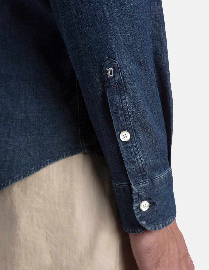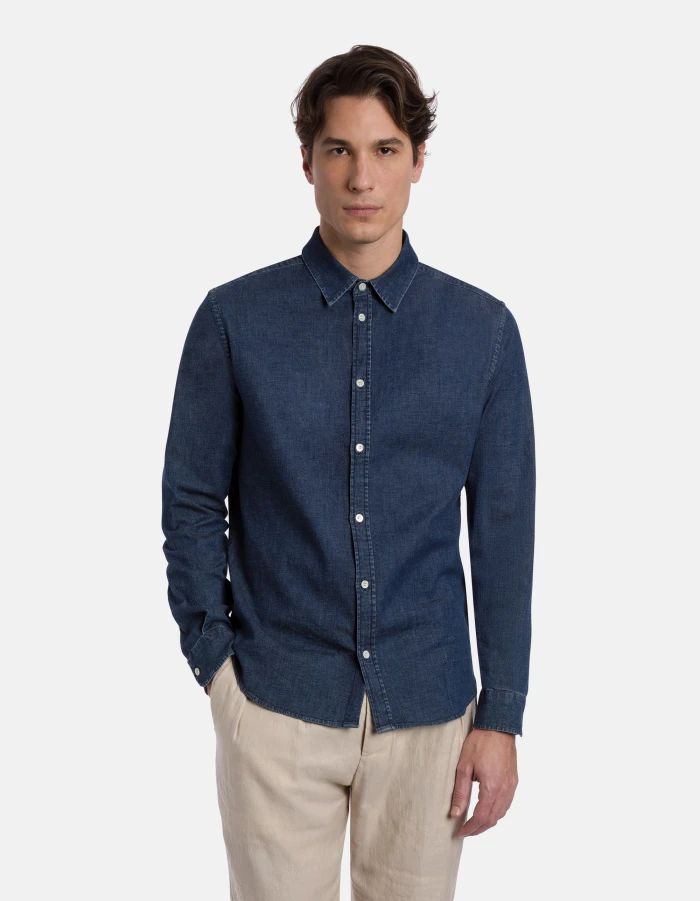 Slim-fit shirt with sail collar, four-hole button fastening. Blue 5.8 oz stretch denim. Clean wash. Dondup logo. Made in Italy