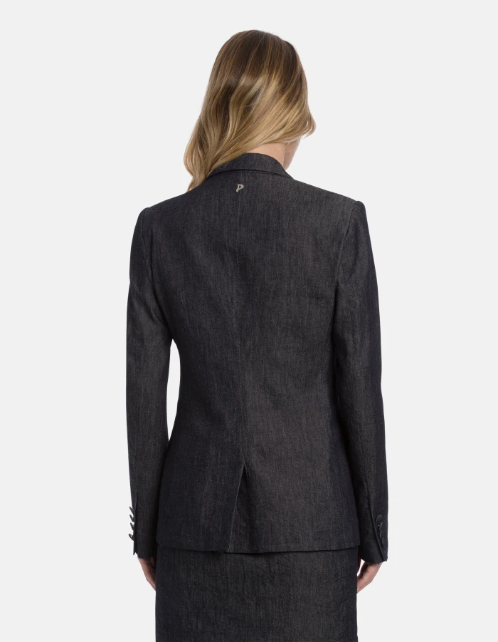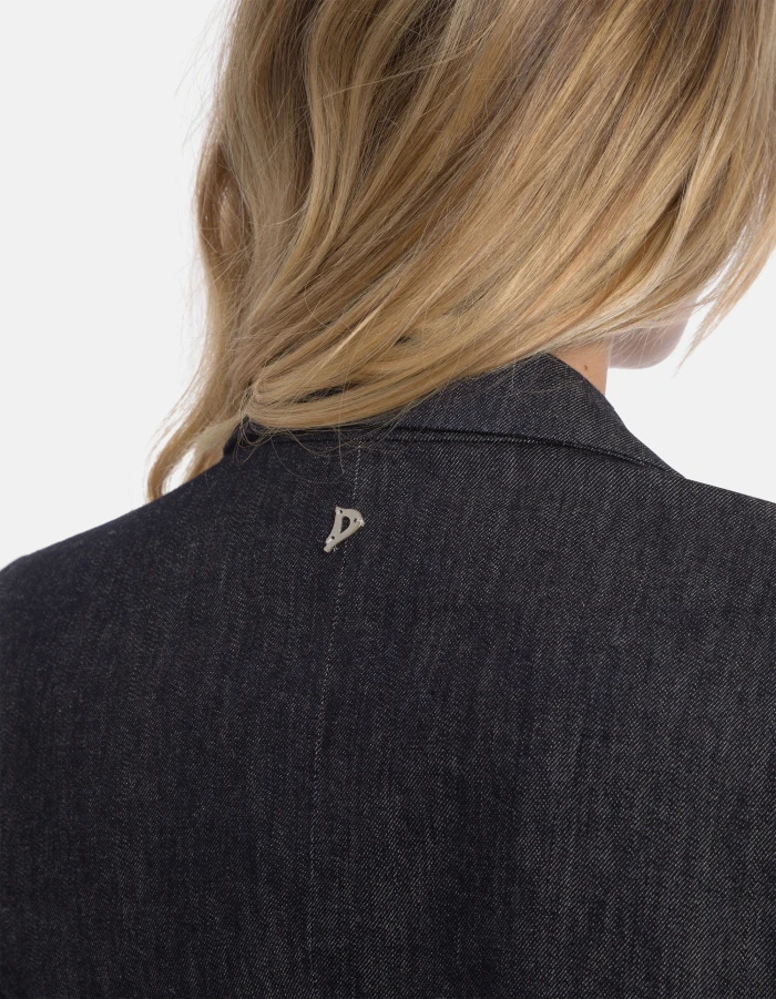 Slim-fit single-breasted blazer with two denim-covered buttons and welt pockets. Blue 7 oz rigid silk denim. Clean dark wash. Dondup logo. Made in Italy
