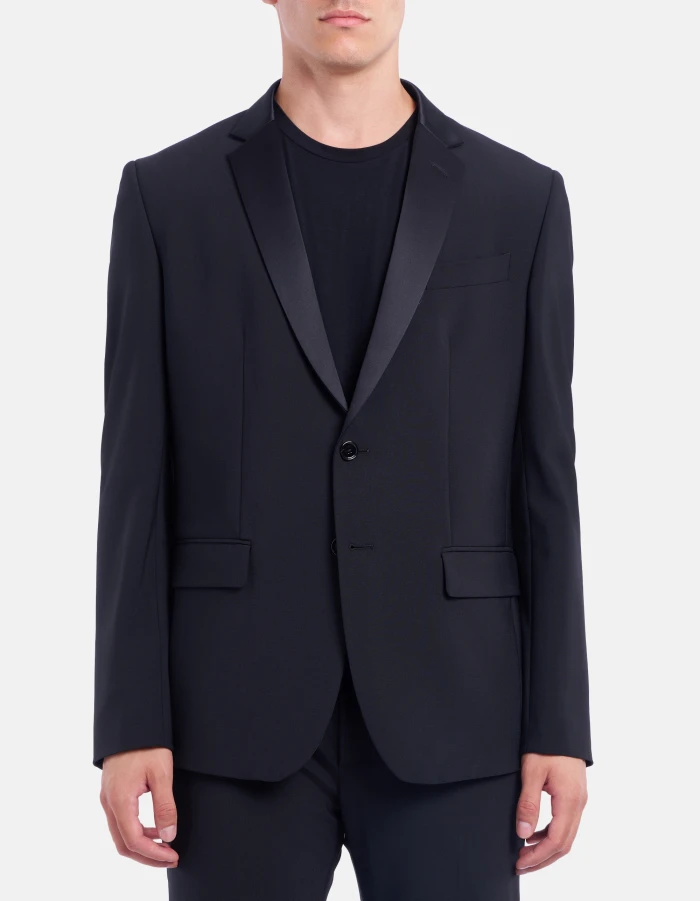 Slim-fit single-breasted lined blazer with two buttons, smoking jacket lapels and flap pockets. Bi-stretch weave. Dondup logo. Made in Italy