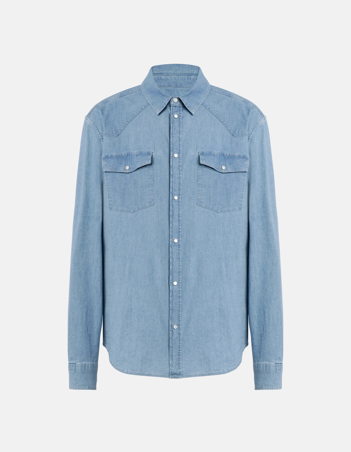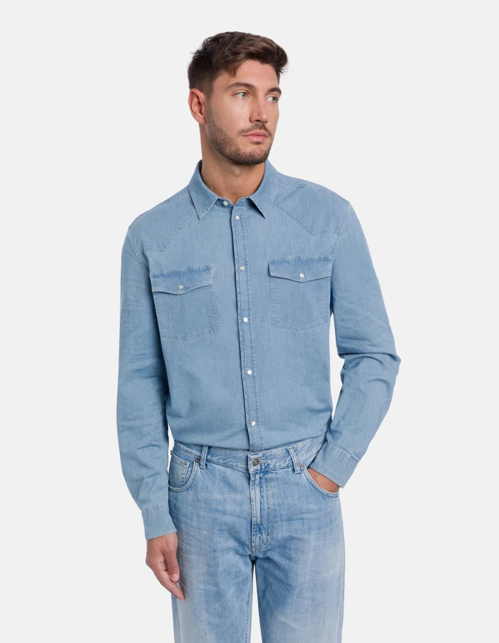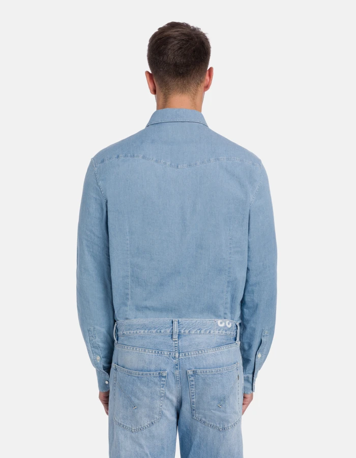 Slim-fit Western-style shirt with pointed yoke at the front, yoke at the back, flap breast pockets and snap-button fastening. Blue 5.8 oz stretch denim. Light clean wash. Dondup logo. Made in Italy