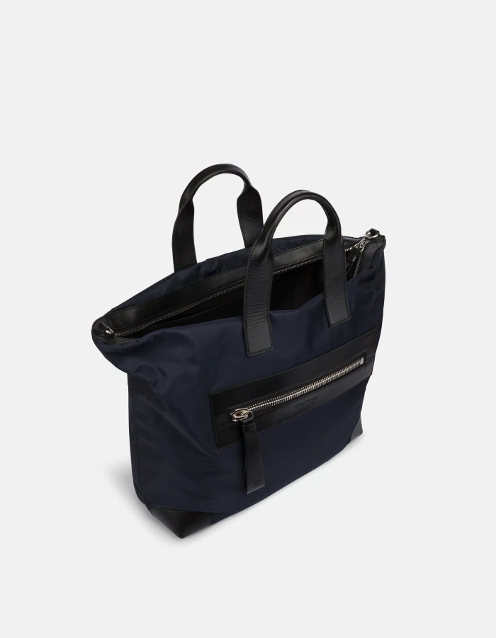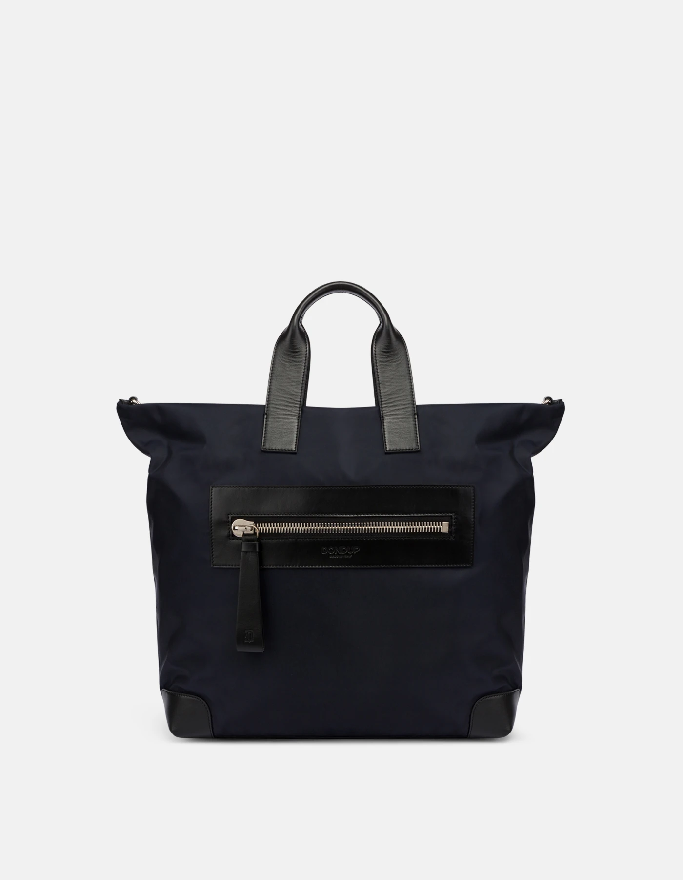 Tote bag with double handle, external pocket with zip fastening and internal iPad pocket. Comes with an adjustable and removable shoulder strap and finished with a heat-embossed logo. Waterproof nylon. Dondup logo. Made in Italy