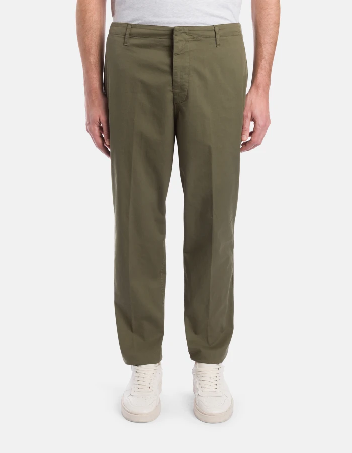 Zyan carrot-cut chinos, regular waist, welt pockets at the back. Lightweight gabardine. Garment dyed. Dondup logo. Made in Italy